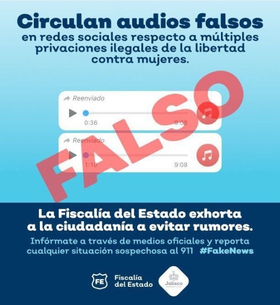 La Fiscalía del Estado de Jalisco alertó sobre los audios falsos que circulan en redes sociales, donde se habla de supuestas privaciones ilegales de varias mujeres en la Entidad.La dependencia recuerda que dichos audios ya habían sido difundidos en años pasados en otros estados del país.La Fiscalía también pidió a la ciudadanía no hacer cadenas masivas en WhatsApp y otras plataformas, para evitar mal informar.Por su parte, la Secretaría de Seguridad del Estado de Jalisco (SSEJ), concordó con que este audio es apócrifo: “No te dejes engañar e infórmate en canales oficiales y evita compartir noticias de dudosa procedencia, crear alerta y pánico en los demás”.Cualquier situación sospechosa, las autoridades piden reportarlo al teléfono de emergencias 911.GC