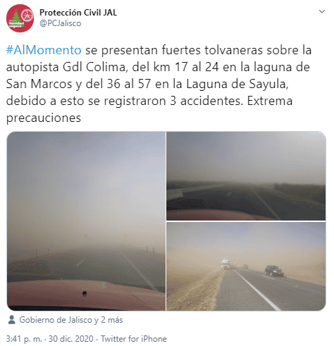 Tres percances viales se suscitaron este miércoles al parecer ocasionados por la escasa visibilidad que han dejado las fuertes tolvaneras sobre la autopista a Colima, informó la Unidad Estatal de Protección Civil y Bomberos Jalisco (UEPCBJ).Desde las dos de la tarde comenzaron a generarse las tolvaneras en la autopista entre las casetas de Sayula y Acatlán, principalmente del kilómetro 17 al 24 en la laguna de San Marcos y del 36 al 57 en la Laguna de Sayula, detalló la dependencia.Hacia las tres de la tarde se reportaron los incidentes entre los kilómetros 52 y 57, uno de los cuales fue un tráiler que se salió del camino; los otros fueron choques.El saldo fue de tres personas lesionadas, aunque no se precisó su estado o en cuál de los hechos fueron heridos.Debido a las tolvaneras y a los hechos viales, las autoridades cerraron la circulación de la autopista. Las autoridades que participan en la atención de los servicios son la UEPCBJ y Bomberos de Atoyac.NR