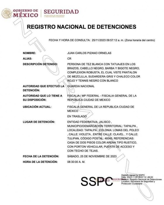 La mañana de este sábado, fuerzas militares hicieron un fuerte operativo en el municipio de Tapalpa, Jalisco en el que habrían detenido a Juan Carlos Pizano Ornelas, alias el "CR", parte del Cártel Nueva Generación.De acuerdo con una ficha del Registro Nacional de Detenciones, el "CR" ya ha sido trasladado a las instalaciones de la Fiscalía General de la República en la Ciudad de México.En la misma ficha se señala que la detención tuvo lugar en la colonia Lomas del Poleo en Tapalpa.La detención de Juan Carlos Pizano Ornelas alias “El CR” se debe a su relación con la desaparición y muerte del coronel del Ejército Mexicano, José Isidro Grimaldo Muñoz, quien fue privado de su libertad el pasado 11 de enero, ocurrida en el municipio de Tapalpa mientras vacacionaba en el lugar. José Manuel, hermano del llamado CR, fue detenido en meses pasados tras ser localizado en el municipio de Chiquilistlán.Durante el operativo se registró un fuerte enfrentamiento entre los elementos federales e integrantes del crimen organizado, como se ha visto en distintos videos que han circulado en redes sociales.Hasta el momento la población del municipio permanece en resguardo y la mayoría de los locales comerciales se encuentran cerrados. Además, las entradas al pueblo de Tapalpa permanecen bajo vigilancia de soldados y el sobrevuelo de los helicópteros continúa.Se pide a la población mantener la calma y permanecer atenta de fuentes oficiales.*Mantente al día con las noticias, únete a nuestro canal de WhatsAppOF