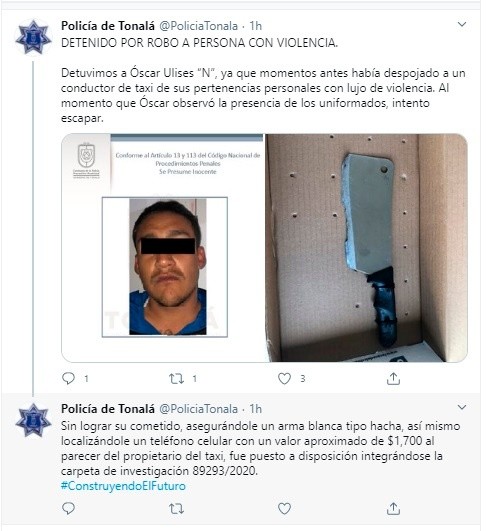 En un camino despoblado, un hombre amagó a un taxista con un hacha de carnicero para despojarlo de sus pertenencias, informó la Comisaría de Seguridad Pública de Tonalá, cuyos elementos detuvieron al presunto delincuente.La persona, de nombre Óscar Ulises “N”, de 24 años, abordó el taxi y le pidió al conductor que circulara sobre el camino a El Vado. Al estar a unos dos kilómetros del fraccionamiento El Moral, el pasajero sacó un hacha de carnicero y lo amagó para que le entregara sus bienes.Sin embargo, en ese momento patrullaban por el camino un par de oficiales de Tonalá. “Al momento que Óscar observó la presencia de los uniformados, intento escapar sin lograr su cometido ya que se le dio alcance metros más adelante”.Los oficiales procedieron a revisarlo y le encontraron el arma utilizada y un celular, el cual fue reconocido por la víctima como parte de los objetos que le robó. Identificó a Óscar Ulises como la persona que lo había asaltado.Óscar Ulises fue puesto a disposición de Ministerio Público, el cual abrió la carpeta de investigación 89293/2020 por el delito de robo calificado. NR