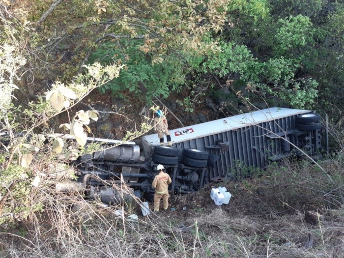Un tráiler de doble remolque protagonizó un percance vehicular al volcar, esta mañana, sobre la Carretera a Colotlán.Los hechos sucedieron poco antes de las 7:00 horas en el kilómetro 19 de la vía ya mencionada, a la altura del balneario “Las Tortugas”, según informó la Unidad de Protección Civil y Bomberos Zapopan, cuyos elementos apoyaron en el percance.En el punto se encontró el tráiler de doble remolque, perteneciente a una empresa de arrendamiento de transporte, que había caído a un pequeño barranco, con una profundidad de unos 15 metros a un costado de la carretera.“La novedad que se tiene es el derrame del combustible, (el camión) está derramando diésel de la tapa de los dos contenedores. Son aproximadamente mil litros de diésel los que se están derramando. Lo que se está haciendo es la contención del diésel en bidones. Vamos a hacer la captación para evitar la captación en la zona”, informó el primer oficial de la corporación municipal, Oscar López.En el sitio no se reportaron heridos, pues al parecer el conductor resultó ileso. El camión permanecerá en el lugar hasta que arriben las grúas que se encargarán de sacarlo de la vía.gc