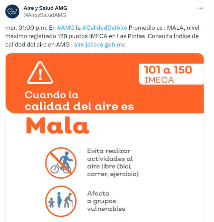 La mala calidad del aire es reportada nuevamente en las distintas estaciones de monitoreo de la ciudad.La Secretaría del Medio Ambiente y Desarrollo Territorial (Semadet) informó que, durante la mañana de este martes, la estación de monitoreo de Las Pintas tuvo registro de mala calidad del aire, razón por la que se activó una precontingencia atmosférica.Hasta las 13:00 horas de este martes, la estación reportó que se habían alcanzado 129 puntos IMECA, por lo que la calidad del aire era mala.Para ello, la Semadet invitó a la población a evitar realizar actividades al aire libre y a tomar precauciones, ya que afecta a grupos vulnerables como adultos mayores, niñas y niños, personas con enfermedades y padecimientos respiratorios, entre otras.Además, otras estaciones de monitoreo de la ciudad también registran mala calidad del aire.Loma Dorada, en Tonalá, reportó 112 puntos IMECA; Tlaquepaque con 109 y Miravalle, en los límites entre Tlaquepaque y Guadalajara, con 105. Otras estaciones de monitoreo como la ubicada en el Centro de Guadalajara, Santa Fe en Tlajomulco de Zúñiga, Atemajac, en Zapopan y Oblatos en Guadalajara, se encuentran en mantenimiento y no reportan datos; en el caso de las dos últimas, tienen poco más de año y medio sin funcionar.El secretario de Medio Ambiente y Desarrollo Territorial, Israel García, había comentado que ya se han emitido dos procesos de licitación para la renovación de la red de calidad del aire, pero han salido desiertos.*Mantente al día con las noticias, únete a nuestro canal de WhatsApp aquí: https://whatsapp.com/channel/0029VaAf9Pu9hXF1EJ561i03MV