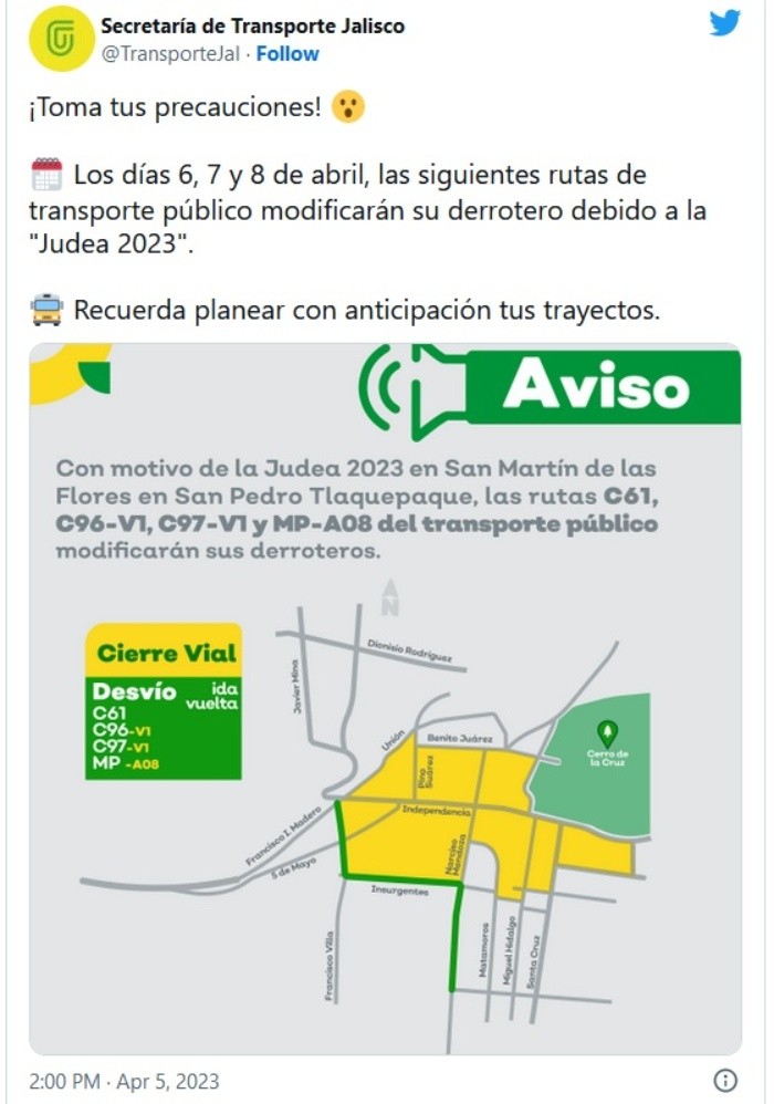 La edición 229 de la Judea de San Martín de Las Flores ya se encuentra a sólo unos días de concretarse y representar el momento de la crucifixión de Cristo; por tal motivo, la Secretaría de Movilidad anunció que se realizarán modificaciones en las rutas de transporte para el priorizar el desarrollo de la tradición.Las rutas de transporte público que se modificarán son la C96-V1, C97-V1, C61 y la MP-A08. Por medio de su cuenta de Twitter, la Secretaría expuso por dónde será el desvío de ida y vuelta de los derroteros antes mencionados: pasarán por Narciso Mendoza, dando vuelta por Insurgentes para integrarse con Francisco Villa. Estas modificaciones se realizarán y mantendrán en el transcurso de los días mayores de la Semana Santa: es decir, 6, 7 y 8 de abril.Es importante recordar que al operativo se incluyeron restricciones para vehículos que transportan gas LP a la plaza central, por lo que serán abiertos tres accesos: El primero por la carretera Libre a Zapotlanejo, ingresando por la calle Libertad, el segundo por Periférico Sur, entrando por la calle Independencia y el tercero por el Camino Al Verde por la calle Narciso Mendoza, de acuerdo con el comandante de la Coordinación de Protección Civil y Bomberos, Jaime Manzano Núñez.En el transcurso de las representaciones solemnes de la Semana Santa participarán mil 700 voluntarios de las diversas entidades del Gobierno municipal de San Pedro Tlaquepaque, por lo que en tu visita encontrarás diversos operativos tanto de tránsito como de salud en caso de que lo necesites.Si planeas asistir a la Judea de este año, te hacemos las siguientes recomendaciones:Jueves Santo, 6 de abril. 19:00 a 22:00 horasViernes Santo, 7 de abril. 15:00 a 20:00 horasSábado de Gloria, 8 de abril. 11:00 a 12:00 horasJM