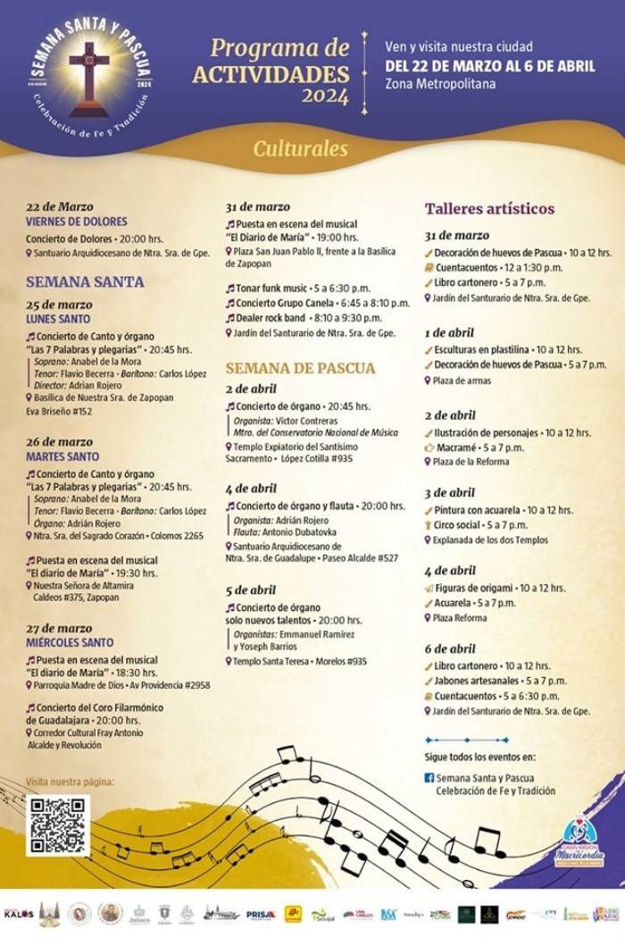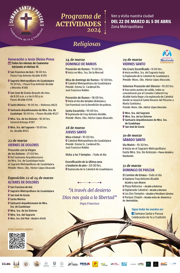 Desde el pasado 22 de marzo comenzaron diversas actividades religiosas y culturales con motivo de la Semana Santa y Pascua en la Zona Metropolitana de Guadalajara.Estas actividades culminarán el próximo 5 de abril.Aquí te compartimos el programa de actividades de este día y los siguientes:*Mantente al día con las noticias, únete a nuestro canal de WhatsApp aquí: https://whatsapp.com/channel/0029VaAf9Pu9hXF1EJ561i03MV