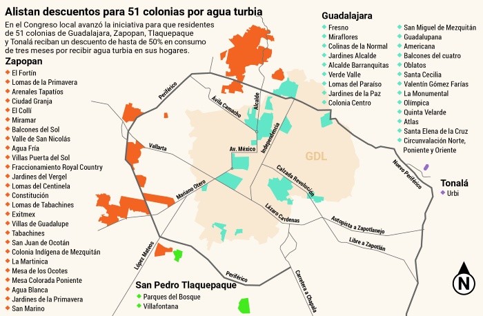 Diputados locales aprobaron ayer la aplicación de descuentos de hasta 50% para los habitantes de 51 colonias de la Zona Metropolitana de Guadalajara (ZMG) afectados por recibir agua turbia en sus domicilios por parte del Sistema Intermunicipal de Agua Potable y Alcantarillado (SIAPA). El beneficio es por el consumo de tres meses. Durante la discusión, Óscar Vásquez, legislador de Morena, afirmó que el listado de zonas perjudicadas debe aumentar. “Estamos a favor de que se apliquen los descuentos, mas no sólo en las colonias que se mencionan en el dictamen. Proponemos (que sea en) todas las comunidades de la zona metropolitana donde el SIAPA otorga el servicio, ya que el problema es un tanto generalizado y derivado de la mala calidad del agua”.El organismo operador dejará de percibir hasta 65 millones de pesos (MDP) por las rebajas en 119 mil cuentas. El miérocles pasado, este medio de comunicación publicó que en Colinas de La Normal, Jardines Alcalde y Alcalde Barranquitas es constante que llegue el agua turbia a las viviendas. “Imagínate estarte bañando con esa agua; las infecciones de ojos, piel y más”, compartió Laura Margarita González, vecina de Colinas de La Normal “Los estudios que se hicieron hace casi tres años arrojaban residuos de cobalto y platino, coliformes fecales y exceso de cloro”, agregó Antonio Rocha, habitante de Jardines Alcalde. Diputados avalaron descuentos de hasta el 50% para usuarios del Sistema Intermunicipal de los Servicios de Agua Potable y Alcantarillado (SIAPA) que recibieron agua sucia en sus hogares.Los descuentos son válidos por el consumo de tres meses para habitantes de 51 colonias de los municipios de Guadalajara, Zapopan, Tlaquepaque y Tonalá por haber recibido servicio de mala calidad de agua potable en sus hogares.En sesión extraordinaria de pleno realizada el viernes, diputados aprobaron el dictamen con 29 votos a favor de las bancadas de Movimiento Ciudadano, PAN, PRI, Hagamos, Futuro y Partido Verde; en contra, fueron 7 votos de Morena.En la discusión, el diputado morenista, Óscar Vásquez, argumentó su voto, ya que criticó que se deben incluir más colonias entre las beneficiarias a los descuentos.En 2022, la Comisión Estatal de Derechos Humanos emitió una recomendación por la mala calidad del agua registrada registrada en 140 colonias de la ZMG; la diputada de MC, Claudia Salas, dijo que se contemplaron apenas 51 colonias porque el SIAPA determinó que son donde se ha registrado mala calidad del agua, además, de que se necesitaría aprobar otro dictamen en caso de que se incrementen las colonias que sean beneficiarias los descuentos.“No se puede incrementar porque el propio dictamen de la Comisión aprobó a las 151 colonias. En todo caso, si quisiéramos abarcar las demás colonias, tendría que ser otra iniciativa y tener el aval del Consejo Técnico del SIAPA donde se beneficie a esas colonias con mala calidad del agua”.En la misma discusión, se aprobó el aumento de las tarifas por el consumo de agua en los municipios incorporados al SIAPA, pese a que se debió realizar desde el año anterior y antes de su publicación en el Periódico Oficial del Estado.
