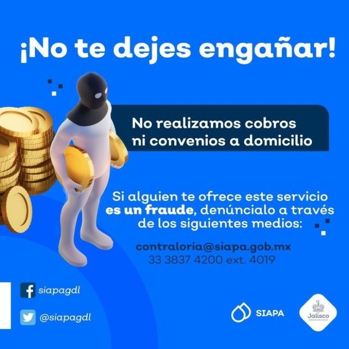 El Organismo Público Descentralizado del Sistema Intermunicipal de los Servicios de Agua Potable y Alcantarillado (Siapa) alertó a la población para evitar ser defraudados por supuestos empleados que hacen cobros o convenios a domicilio, la instancia advierte que así no laboran.En sus post en redes sociales especifica que no te dejes engañar. “En SIAPA no realizamos cobros, ni convenios a domicilio. Denuncia a cualquier persona que acuda a tu hogar o negocio y quiera cobrar por algún servicio”, destaca la publicación.Además agrega que es importante que como ciudadano evites ser extorsionado. Si alguien te ofrece este servicio de cobro o convenio, es un fraude, y puedes denunciar por los siguientes medios.Luis Pérez, uno de los afectados, detalla cómo actúan estos defraudadores:“Llegaron a mi departamento entre tres y cuatro hombres, con ropa y logos del Siapa, según eso revisan lo que debes y dicen que te van a cortar el agua, amenazan con una llave stilson y que es importante que se ponga al corriente, les dije que iría a oficinas a arreglarlo, e insistieron y pidieron una aportación para no quedarnos sin agua, por la presión les di 100 pesos, ya no los he vuelto a ver”, describió.FS