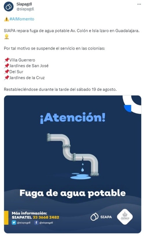 El Sistema Intermunicipal de los Servicios Agua Potable y Alcantarillado (Siapa) reportó otro corte de agua, ahora en algunas colonias del municipio de Guadalajara debido a que se presentó una fuga de agua.A través de las redes sociales, Siapa reportó que se encuentran reparando una fuga de agua potable en la Av. Colón e Isla Izaro en Guadalajara.Por este motivo, las siguientes cuatro colonias no contarán con servicio durante las próximas horas:El servicio se restablecerá durante la tarde de este sábado 19 de agosto. En caso de cualquier duda o aclaración, el Siapa pone a disposición los siguientes medios para que resuelvas tus preguntas.MF