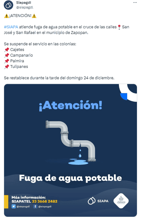 El Sistema Intermunicipal de los Servicios Agua Potable y Alcantarillado (Siapa) informó que habrá corte de agua en cuatro colonias del municipio de Zapopan, por lo que se hizo un llamado a los usuarios para tomar precauciones. A través de las redes sociales, el Siapa reportó que se atiende una fuga de agua potable en el cruce de las calles San José y San Rafael de dicho municipio.Por este motivo estas cuatro colonias no tendrán servicio de agua:El servicio de agua potable se restablecerá durante la tarde del domingo 24 de diciembre.En caso de cualquier duda o aclaración, el Siapa pone a disposición los siguientes medios para que resuelvas tus preguntas.MF