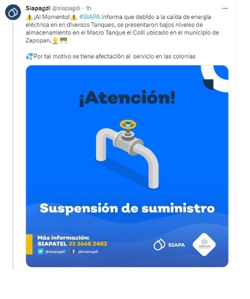 La tarde de este martes, el Sistema Intermunicipal de los Servicios Agua Potable y Alcantarillado (Siapa) reportó que habrá un corte de agua en más de 20 colonias en el municipio de Zapopan, por lo que hizo un llamado a los usuarios para tomar precauciones. A través de sus redes sociales, Siapa reportó que debido a la caída de energía eléctrica en diversos Tanques, se presentaron bajos niveles de almacenamiento en el Macro Tanque el Colli ubicado en dicho municipio.Por tal motivo se suspenderá el servicio en las siguientes colonias de Zapopan: Se espera que el servicio de agua se restablezca durante la mañana del miércoles 17 de enero.Ante cualquier duda o aclaración, el Siapa pone a disposición los siguientes medios para que resuelvas tus preguntas.MF