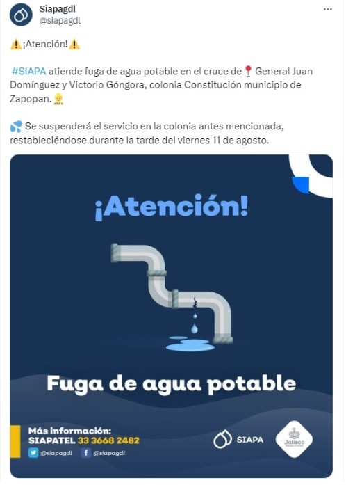 El Sistema Intermunicipal de los Servicios Agua Potable y Alcantarillado (Siapa) reportó que este jueves habrá un corte de agua en el municipio de Zapopan, por lo que una colonia de dicho municipio se verá afectada con el servicio. A través de sus redes sociales, el Siapa dio a conocer que se encuentran reparando una fuga de agua en el cruce de General Juan Domínguez y Victorio Góngora, en la colonia Constitución de Zapopan.Por tal motivo, la colonia antes mencionada no tendrá servicio de agua potable desde hoy jueves y regresará a su normalidad durante la tarde de mañana viernes 11 de agosto. En caso de cualquier duda o aclaración, el Siapa pone a disposición sus medios de comunicación para que resuelvas tus preguntas.MF