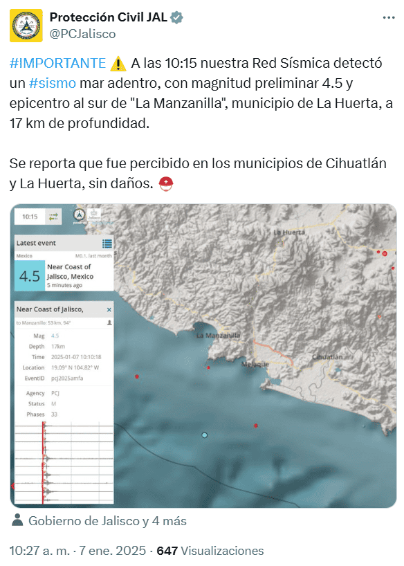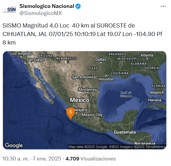Este martes 7 de enero, el Servicio Sismológico Nacional (SSN) informó que se registró un sismo en Cihuatlán, Jalisco.De acuerdo con el organismo, el temblor ocurrió a las 10:10 horas de la mañana de hoy, a 40 kilómetros al suroeste de la costa sur de Jalisco. Tuvo una magnitud de 4.0, a una profundidad de 8 km."SISMO Magnitud 4.0 Loc 40 km al SUROESTE de CIHUATLAN, JAL 07/01/25 10:10:19 Lat 19.07 Lon -104.90 Pf 8 km", dice la publicación en la cuenta de X @SSNMexico.También mediante la plataforma X, Protección Civil Jalisco (@PCJalisco) dijo que a las 10:15, su red sísmica detectó un sismo mar adentro, con magnitud preliminar 4.5 y epicentro al sur de "La Manzanilla", municipio de La Huerta, a 17 km de profundidad."Se reporta que fue percibido en los municipios de Cihuatlán y La Huerta, sin daños", aclaró la dependencia. *Mantente al día con las noticias, únete a nuestro canal de WhatsAppOF