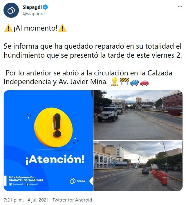Tras reparar la zona donde se registró un socavón, esta tarde se reabrió la circulación en el tramo afectado en la Calzada Independencia, en el Centro de Guadalajara, informó hoy el Siapa."Se informa que ha quedado reparado en su totalidad el hundimiento que se presentó la tarde de este viernes 2. Por lo anterior se abrió a la circulación en la Calzada Independencia y Av. Javier Mina", dijo vía Twitter el Sistema Intermunicipal de los Servicios de Agua Potable y Alcantarillado (Siapa).La vialidad fue cerrada entre las avenidas Javier Mina y República- Hidalgo, en los carriles en sentido sur-norte, luego de la formación de un socavón de 6 metros de largo por 2 de ancho y 2.5 metros de profundidad, el pasado viernes 2 de julio.El socavón estaba entre la avenida Javier Mina y la calle Dionisio Rodríguez, en la zona del mercado San Juan de Dios y autoridades indicaron que no representaba riesgo para inmuebles colindantes.IM