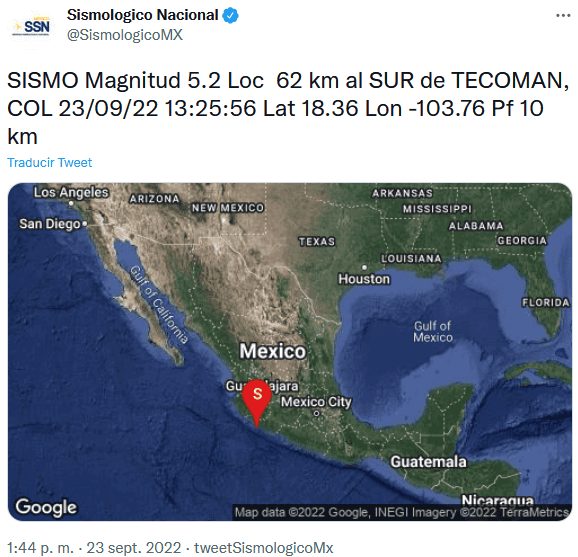 El alcalde de Guadalajara, Pablo Lemus confirmó el sismo de la tarde de este viernes 23 de septiembre, con epicentro al sureste de Tecomán, Colima, y de magnitud 5.2, que se sintió en Jalisco, pero descartó daños. "Me confirma el comandante de Protección Civil y Bomberos, que fue un sismo que se registró el día de hoy, alrededor de la 01:20, magnitud 5.6 grados, su epicentro en Tecomán, Colima; y en Guadalajara, afortunadamente no tenemos ninguna afectación gracias a Dios, ni humana, ni material, gracias a Dios", declaró Lemus en el Paseo Alcalde, luego de desalojar la Presidencia Municipal.Originalmente, el Servicio Sismológico Nacional había informado que el sismo tenía una magnitud de 5.6, pero minutos más tarde ajustó la cifra a 5.2Pablo Lemus pidió a la población mantenerse informada por las redes sociales y, en caso de necesitar algún apoyo, marcar al 911.OA