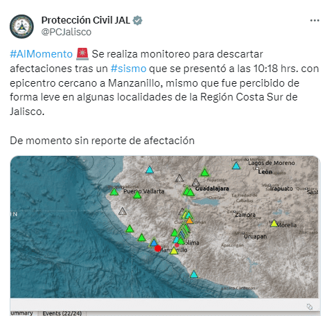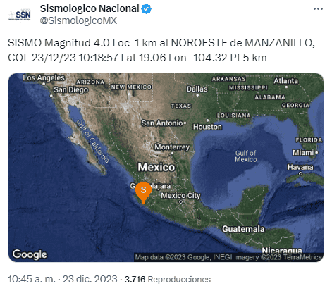 Este sábado 23 de diciembre, a las 10:18 horas, se registró un sismo en la costa de Colima, el cual fue percibido de forma leve en algunas regiones de la costa sur del Estado de Jalisco. Según el Servicio Sismológico Nacional (SSN), el temblor de hoy ocurrió a 1 kilómetro al noroeste de Manzanillo, de magnitud 4.0, a una profundidad de 5 kilómetros.En sus redes sociales, Protección Civil Jalisco informó que se realiza monitoreo para descartar afectaciones.De momento no hay reporte de daños.También en sus plataformas, PC Estatal de Colima informó que activó los protocolos correspondientes ante la ocurrencia. Indicó que el sismo fue sentido de manera ligera en algunos municipios de la entidad. Explica que el temblor no ameritó la alerta sísmica debido a que su magnitud no fue mayor a 5.Piden a la población mantenerse atenta en los canales oficiales.*Mantente al día con las noticias, únete a nuestro canal de WhatsAppOF