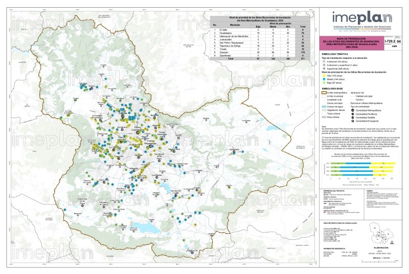 Un total de 15 nuevos puntos de inundación recurrente han sido identificados en la Zona Metropolitana previo al inicio del temporal de lluvias, con el objetivo de alertar a la ciudadanía ante posibles riesgos.Lo anterior, según la actualización de 2024 hecha por el Instituto Metropolitano de Planeación (Imeplan) del Mapa Único de Inundaciones (MUI), en el cual suman ya, con estos nuevos 15 puntos, un total de 371 Sitios Recurrentes de Inundación (SRI) en los municipios de Guadalajara, Tlaquepaque, Tlajomulco y Zapopan.De este total, 140 se identifican en prioridad alta, 144 media y 87 baja. Además, 35 coinciden con pasos a desnivel y su nivel de prioridad es alta: ocho pasos a desnivel están próximos a cauces, siete están sobre cauces desaparecidos y en tres se han presentado fallecimientos, añadió el Imeplan.“El aumento de los SRI está ligado al incremento en los registros sobre inundaciones en sitios donde anteriormente eran esporádicas y hoy en día son recurrentes, lo que modifica su clasificación de sitio de monitoreo a recurrente. Es decir, eventos de lluvias intensas de corta duración en sitios específicos, (lluvias convectivas) y/o lluvias intensas de larga duración (lluvias torrenciales), en sitios donde anteriormente eran poco frecuentes las inundaciones”, detalló el Imeplan. Aunque se identificaron 15 nuevos SRI este 2024, sólo representan 11 más en comparación al 2023; esto es debido a que, del total registrado el año pasado, dos fueron reclasificados como Sitios de Monitoreo de Inundación, mientras que tres más se unificaron por su contigüidad, explicó el Instituto. Algunas acciones que contribuyen a mitigar el riesgo de inundación, son la construcción de infraestructura que permita retener, captar e infiltrar de manera inducida el agua de lluvia, así como la limpieza, desazolve y saneamiento de la infraestructura ya existente que evite el arrastre de objetos durante las lluvias.Este fue el caso del Sitio de Monitoreo de Inundación (SMIT-001) ubicado entre las calles José Figueroa y San Fernando, en la colonia Nueva Santa María del municipio de Tlaquepaque, el cuál se registra como el primer Sitio de Inundación Mitigado en el AMG. Durante el 2023, el ayuntamiento de Tlaquepaque ejecutó varias acciones que contribuyeron a mitigar las inundaciones en el sitio, donde destaca la construcción de colectores pluviales en la zona de aporte, explicó el Imeplan.Con el Mapa Único de Inundaciones y el Atlas Metropolitano de Riesgos, donde se han establecido las zonas de prioridad alta, y riesgo alto y muy alto de inundación, respectivamente, el Imeplan impulsa la ejecución de acciones prioritarias y coordinadas para la mitigación de las inundaciones.Además, con la actualización del POTmet, se busca proteger los cauces y cuerpos de agua, impulsar una estrategia de infraestructura verde, y promover el desarrollo sustentable a través de la conservación de las zonas de alto valor ambiental que proveen servicios ecosistémicos, entre los que se encuentra la infiltración, finalizó el Instituto. MF