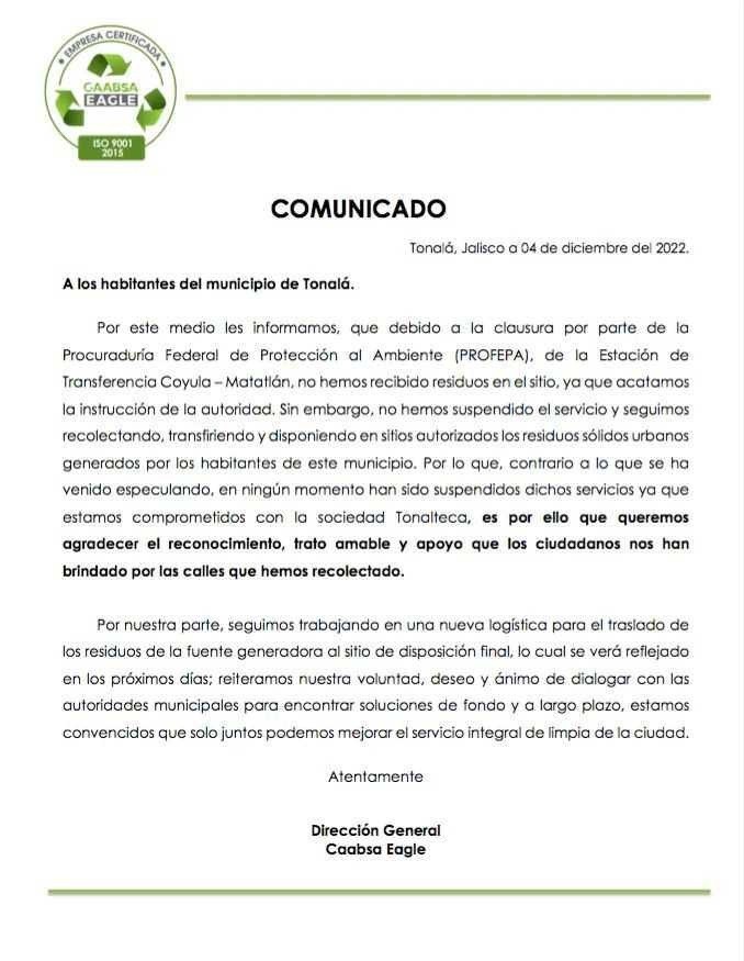 Como una forma de "hacer presión a las autoridades" los vecinos de las colonias afectadas por la suspención del servicio de recolección de basura han comenzado a llevar sus desechos a lugares públicos concurridos como glorietas, camellones y avenidas principales.Dicha problemática se suscitó a raíz del cierre del vertedero de Matatlán por parte de la PROFEPA, al que era destinada toda la basura recolectada en las colonias como Infonavit Río Nilo, Loma Dorada y La Soledad, Santa Paula, Jalisco primera y segunda sección, Jardines de la Cañada, Camichines, Los Amiales y Privadas de la Reina, entre otras. La crisis se ha convertido en un problema de salud y seguridad pública, en el que vecinos aseguran que las autoridades no han hecho nada. Es el caso de la colonia Loma Dorada, donde vecinos de la zona han comenzado a depositar sus residuos en la concurrida glorieta conocida como "Los Arcos de Loma Dorada", puesto que siendo un espacio público, vecinos aseguran que el camión de recolección si levanta la basura de ese punto.Habitantes de la zona reportan que la "delegada" se acercó a ellos días atrás para organizar una solución temporal al asunto, mientras las autoridades competentes se encargaban de reestablecer y regular el servicio de recolección. "Nos pideron a todos nosotros (vecinos de los edificios de Infonavit) que trajeramos nuestra basura aquí y nos cobraron $20 por departamento, que alguien vendría a recogerla toda, pero eso nunca pasó", declara Martha, vecina afectada de la colonia.La noche de ayer los vecinos de la zona se reunieron en ese punto para juntar la basura y trasladarla a la glorieta de Los Arcos, con el temor de ser detenidos por la policía pero cansados de la situación, "Nos explicaron que no era ilegal, que colocaramos la basura donde pudieramos, pero aún así nos preocupa un poco, vino la policía porque les reportaron que la estabamos quemando, pero no". Explicó Josefina, vecina afectada.Para evitar que la basura se siguiera recolectando ahí, colocaron letreros que advierten a los habitantes de los edificios que trasladen sus desperdicios a la glorieta de Los Arcos de Loma Dorada.Mientras el alcalde de Tonalá Sergio Chávez Dávalos se encuentra trabajando para dar resolución a la problematica, la empresa Caabsa Eagle, quien se encarga de la recolección de residuos y despercidios urbanos lanzó un comunicado en redes sociales el pasado 4 de diciembre, donde aclaran que los servicios no han sido suspendidos.