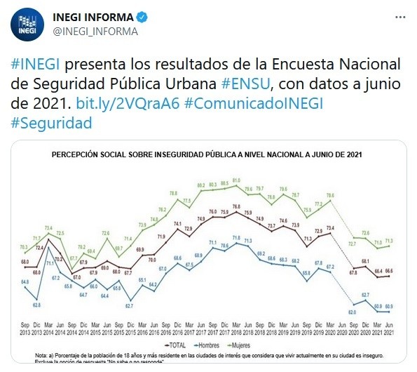 El 66.6% de la población de 18 años y más, es decir, dos de cada tres adultos consideraron que vivir en su ciudad es inseguro, de acuerdo con los resultados de la Encuesta Nacional de Seguridad Pública Urbana (ENSU), realizada por el Inegi en la primera quincena de junio de 2021.Este porcentaje representa un cambio estadísticamente significativo con respecto del registrado en diciembre de 2020, que fue de 68.1%. Sin embargo, no representa un cambio estadísticamente significativo con respecto a marzo de 2021, que fue de 66.4%, explicó el Instituto.En esta edición, 12 ciudades tuvieron cambios estadísticamente significativos con respecto a marzo de 2021: cuatro tuvieron reducciones y ocho incrementaron.La percepción de inseguridad siguió siendo mayor en el caso de las mujeres con 71.3%, mientras que para los hombres fue de 60.9 por ciento.Las ciudades con mayor porcentaje de personas de 18 años y más que consideraron que vivir en su ciudad es inseguro fueron: Fresnillo con una tasa de 96.2%; Cancún, 88.7%; Ecatepec, 87.7% Coatzacoalcos, 86.9%; Naucalpan, 86.7%; y Tonalá con 86.1 por ciento.Por otro lado, las ciudades con menor percepción de inseguridad fueron: San Pedro Garza García con una tasa de 7.1%; Tampico, 24.4%; Los Cabos, 25.4%; San Nicolás de los Garza, 25.9%; Mérida 26.3%; y Piedras Negras, 28.8 por ciento.A nivel nacional, 27.7% de los hogares contó con al menos una víctima de robo y/o extorsión durante el primer semestre de 2021. Las ciudades con mayor porcentaje de hogares con al menos una víctima fueron: Gustavo A. Madero con una tasa de 54.9%; Iztapalapa, 44.9%; Chimalhuacán, 44.3%; Azcapotzalco, 41.8%; y Álvaro Obregón, 39.6 por ciento.En cuanto a víctimas de actos de corrupción por parte de autoridades de seguridad pública, de enero a junio de 2021, se estima que 12.6% de la población de 18 años y más tuvo contacto con alguna autoridad de seguridad pública, del cual 46.8% declaró haber sufrido un acto de corrupción por parte de éstas.En esta edición se proporciona información estadística sobre víctimas de acoso personal y violencia sexual. Se estima que de la población de 18 años y más, durante el primer semestre de 2021, 16.6% fue víctima de acoso personal y/o violencia sexual. En el caso de las mujeres, este porcentaje fue de 24.7%, mientras que en hombres fue de 6.9 por ciento.Por primera vez, la ENSU identifica la frecuencia de salida de su vivienda, ya sea por cuestiones laborales, escolares, de salud, para realizar compras, etcétera. Se estima que 52% de la población de 18 años y más en zonas urbanas, salió diariamente de su vivienda durante el segundo trimestre de 2021, de los cuales el 66.1% tuvo sensación de inseguridad.OA