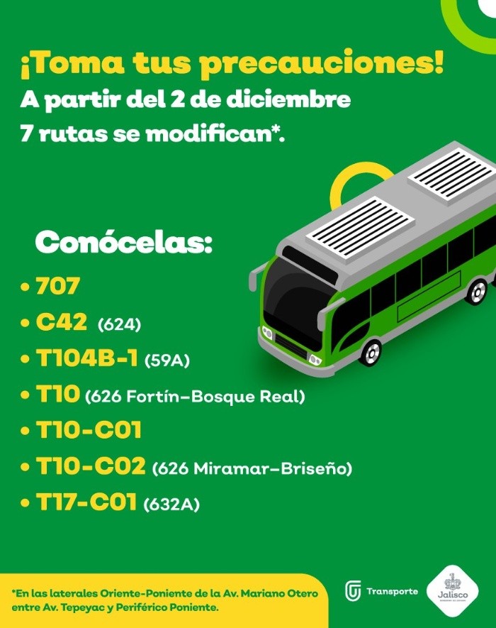 La Secretaría de Transporte (Setran) informa que siete rutas de transporte público colectivo modificarán su derrotero habitual por un lapso de dos meses a partir del día de hoy.El desvío de rutas se debe a que el Ayuntamiento de Zapopan realizará obras en las laterales oriente-poniente de la avenida Mariano Otero, en el tramo comprendido de avinida Tepeyac a Anillo Periférico Poniente.Las rutas de transporte público que presentan cambios son: 707, T04B-1 (59A), T10 (626 Fortín–Bosque Real), T10-C01 y T10-C02 (626 Miramar–Briseño), C42 (624) y T17-C01 (632A).Los derroteros 707, T04B-1 (59A), T10 (626 Fortín–Bosque Real), T10-C01 y T10-C02 (626 Miramar–Briseño), que circulan por las laterales de la Av. Mariano Otero, se integrarán en ambos sentidos a los carriles centrales y circularán tanto de ida como de vuelta sobre el paso a desnivel Mariano Otero-Periférico.La C42 (624), que circula por Av. Tepeyac, se desviará en su derrotero de ida por Av. Tepeyac para continuar por Av. Dr. Mateo del Regil hacia la lateral de Anillo Periférico donde termina su desviación. De regreso no se modificará.Finalmente, la ruta: T17-C01 (632A) que circula por Av. Guadalupe hacia Av. Tepeyac, se desviará sobre Anillo Periférico en ambos sentidos tanto de ida como de vuelta para continuar con su recorrido por Anillo Periférico.NR