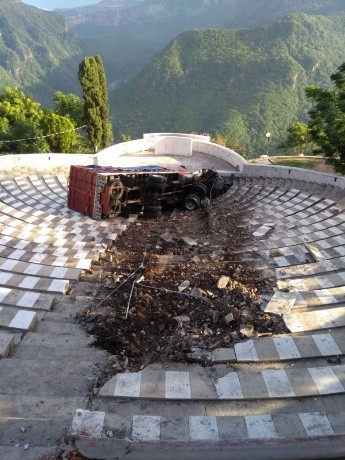 GUADALAJARA, JALISCO.- El chofer de un trailer que al parecer se encontraba bajo el influjo de drogas atravesó el auditorio de la Barranca de Huentitán.Medios locales y Bomberos de Guadalajara informaron que el trailer accidentado era perseguido por las autoridades desde la Calzada Independencia y San Juan de Dios, por donde circulaba a exceso de velocidad rumbo a la Barranca de Huentitán. A su paso por la Calzada Independencia el trailer se impactó contra tres vehículos.Luego de ser perseguido por casi 10 kilómetros el conductor terminó impactando contra el auditorio, que se encuentra justo al borde de la barranca.Debido a la velocidad a la que iba el tráiler se saltó una parte de la entrada del auditorio, aterrizó en las gradas por las que se deslizó y arrasó con una parte de ellas, deteniéndose metros antes de caer por el precipicio.De acuerdo con los informes el chofer del vehículo aseguró que estaba huyendo pues "el diablo lo perseguía". Se desconoce si sufrió lesiones o si fue detenido.