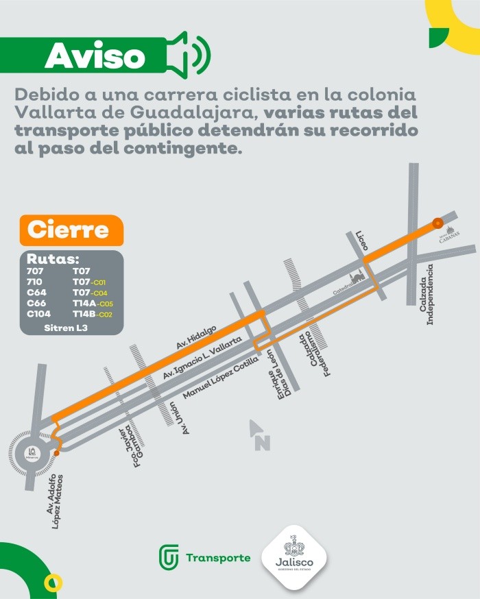 Las rutas C66, T07, T07-C01 y T07-C04 interrumpirán su derrotero al llegar a Avenida Enrique Díaz de León en su sentido de Avenida Miguel Hidalgo y Costilla a Avenida Juárez.
