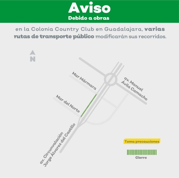 Este viernes el Gobierno de Jalisco dio a conocer se se realizará un cierre vial con motivo del las obras que se llevarán a cabo en la lateral de la avenida Circunvalación Jorge Álvarez del Castillo en sentido norte a sur, entre las calles Mar Mármara y Mar del Norte en la colonia Country Club, en el municipio de Guadalajara.Por este motivo, dijo a través de la Secretaría de Transportes que a partir de mañana sábado 23 de marzo las rutas del transporte público C108, T09-C1 y T09-C2 modificarán sus recorridos hasta finalizar los trabajos, de los cuales no dio fecha aproximada. De circular en su trayecto de norte a sur por la avenida Circunvalación Jorge Álvarez del Castillo, dichas rutas se incorporarán a los carriles centrales del paso a desnivel al cruce con la avenida Manuel Ávila Camacho, y al pasar éste se incorporarán a las laterales de la primera avenida para continuar su recorrido habitual. La Setran especificó que en su trayecto de sur a norte (es decir, de la Glorieta Colón hacia Ávila Camacho) las rutas mencionadas no sufrirán modificaciones.Por último, la dependencia envió un mensaje a la ciudadanía para que pueda prever sus traslados, así como sus ascensos y descensos, a fin de que pueda llegar a tiempo y sin imprevistos a su destino. EE