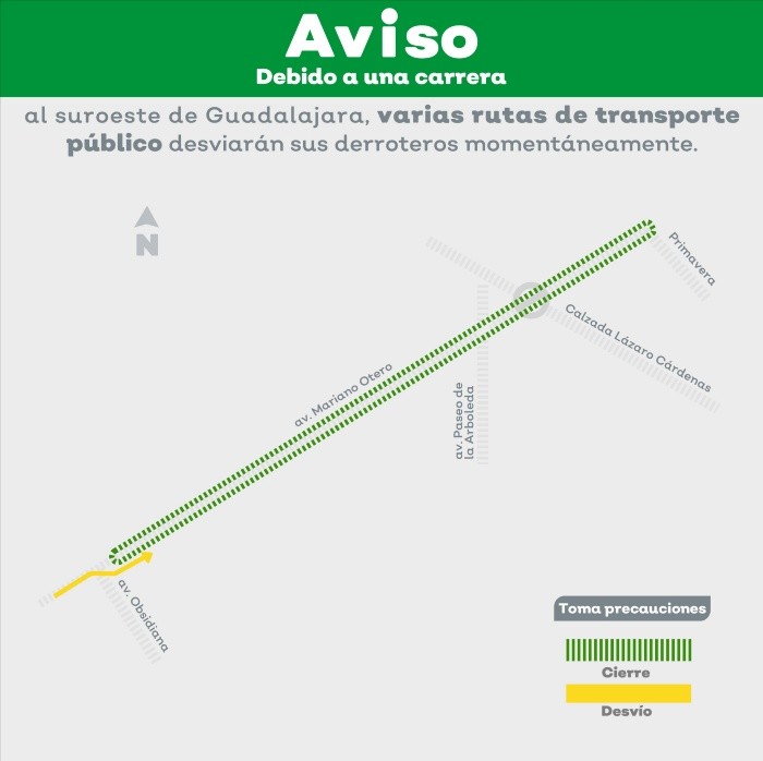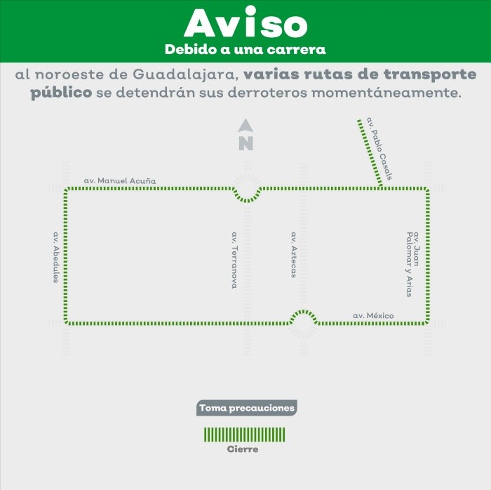 La Secretaría de Transporte Jalisco informó que el próximo domingo 26 de mayo, algunas rutas de transporte público modificarán sus recorridos momentáneamente, debido a dos carreras deportivas que se realizarán en Guadalajara y Zapopan. Respecto a la primera carrera, se realizará en la colonia Prados Providencia de Guadalajara, en donde las y los participantes saldrán a las 7:00 horas a un costado de la radiodifusora que se encuentra en la av. Pablo Casals casi esquina con Manuel Acuña.Por lo anterior, estas son las rutas que detendrán su recorrido de forma momentánea al llegar a las vialidades donde se desarrollará el recorrido en: av. Terranova, av. México, av. Abedules, av. Manuel Acuña y av. Pablo Casals.Las rutas C18-V1 y C18-V2 se detendrán sobre la av. Manuel Acuña, de poniente a oriente, entre av. Aztecas y av. Terranova.Sobre la av. Terranova, de norte a sur, entre av. Manuel Acuña y av. México, se detendrán las rutas T08-C01 y T18 Terranova.Por último, las rutas C01, C70, C104, C107, C121A, C121B, C136, T06-2, T06-C02 y T08-C01 se detendrán en av. México, de oriente a poniente, entre av. Terranova y av. Abedules.Por otro lado, en la segunda carrera se realizará sobre la avenida Mariano Otero en Zapopan, a la misma hora que la primera, a las 7:00 horas, el contingente sandra frente a la calle Amatista, a un costado del centro comercial, sobre los carriles centrales de dicha avenida.Las rutas que modificarán su recorrido de forma momentánea serán:C51-V1 y C51-V2, en sentido de ida circulan por av. Obsidiana se desvían hacia av. Mariano Otero donde retornan, para regresar por la calle Ámbar, circularán sobre Turquesa hasta av. Obsidiana donde seguirán su ruta regular.Las rutas C49-V1, y C49-V2 en sentido de ida, al circular sobre av. Topacio, retornarán en el cruce de esta con av. Mariano Otero, mientras que de regreso al circular sobre av. Mariano Otero, girarán sobre av. Paseo de la Arboleda, hasta la calle Diamante, continuarán hasta av. Topacio, para seguir su derrotero regular.La ruta C104, en sentido de ida no modificará su derrotero, mientras que de regreso, circulará por av. Paseo de la Arboleda hasta calle Diamante, se desviará por av. Topacio, hasta av. Lapislázuli, av. Obsidiana hasta llegar a av. Mariano Otero, donde continuará su recorrido habitual.La ruta T01 18 de Marzo, en su sentido de ida circula por av. Lapislázuli, se desviará al llegar a av. Topacio, continuará por esta hasta av. Mariano Otero, donde retornará siguiendo el sentido inverso, para continuar por av. Lapislázuli su derrotero habitual.Las rutas que sufrirán retrasos momentáneos en la operación del servicio serán durante esta carrera serán: C78 Agua Blanca, C78 Felipe Ángeles, C78 Guadalupe Gallo, C104 Plaza del Sol, C104 Plaza Galerías, C108, C125, C125-V2, C128A-V2, C130, T10, T10-C01, T10-C02, T04B-1, T04B-2, T04B-3, T04B-4, T11B y C49 Arboledas, al paso del contingente de corredores.NA
