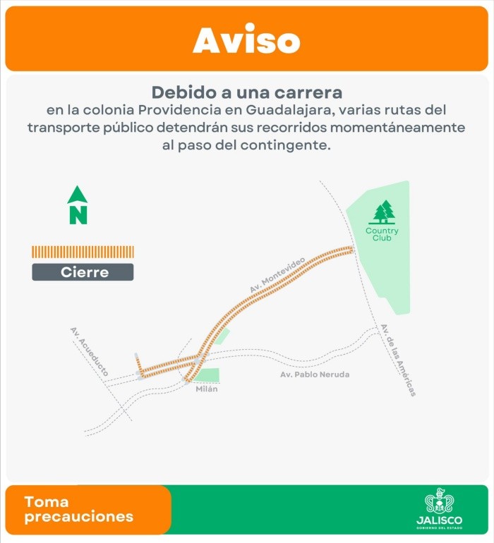 La Secretaría de Transporte Jalisco informó que el próximo domingo 1 de junio algunas rutas de camiones detendrán sus recorridos en la Zona Metropolitana de Guadalajara (ZMG) con motivo de dos carreras deportivas.El primer evento deportivo se realizará en el municipio de Zapopan sobre las avenidas: Prado de los Laureles, Cuauhtémoc, Tizoc, Tepeyac y Guadalupe, y las calles Santa Rosa de Lima y Santa Teresa de Jesús.Las rutas que se detendrán momentáneamente a partir de las 6:30 horas serán: C70,T11A, T11A-C01, T11A-C02 y T11A-C03.La segunda carrera se realizará en la colonia Providencia en Guadalajara, por lo que se cerrará la avenida Montevideo, de igual forma las rutas de camiones que se verán afectadas serán apartir de las 6:30 de la mañana: C54, C64 y C65.NA