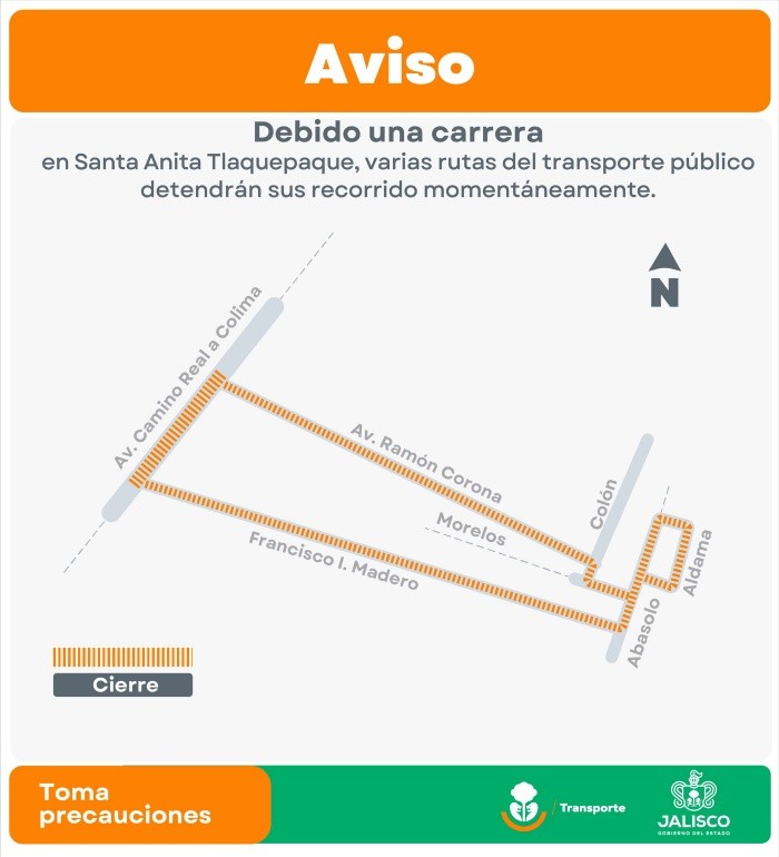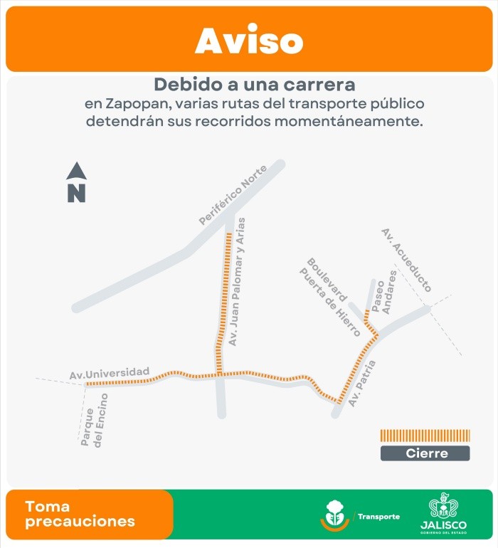 La Secretaría de Transporte Jalisco informó que el próximo domingo 17 de agosto varias rutas de camiones detendrán sus recorridos en la Zona Metropolitana de Guadalajara (ZMG) con motivo de dos carreras deportivas.El primer evento deportivo se realizará en Santa Anita Tlaquepaque en donde se cerrarán las avenidas Camino Real a Colima y Ramón Corona, además de las calles: Francisco I Madero, Abasolo y Aldama.Las rutas de transporte público que pararán sus recorridos al paso del contingente a partir de las 6:30 de la mañana del próximo domingo serán:C09, C10, C127A, C128A-V1, C128A-V1, C133, A05 de Mi Macro Periférico, C02 y C03 de la Ruta López Mateos.Por otro lado, la segunda carrera se realizará en el municipio de Zapopan, en donde se cerrarán las avenidas: Universidad, Patria, Juan Palomar y Arias, y el Boulevard Puerta de Hierro.De igual forma las siguientes rutas se verán afectadas a partir de las 6:30 am:C120, C121A, C121B, C136, C43 Arco del Triunfo, C54, C71, C71 Preparatoria #12, T17, T17-1, T17-C01 y C140 Parques de Tesistán.NA