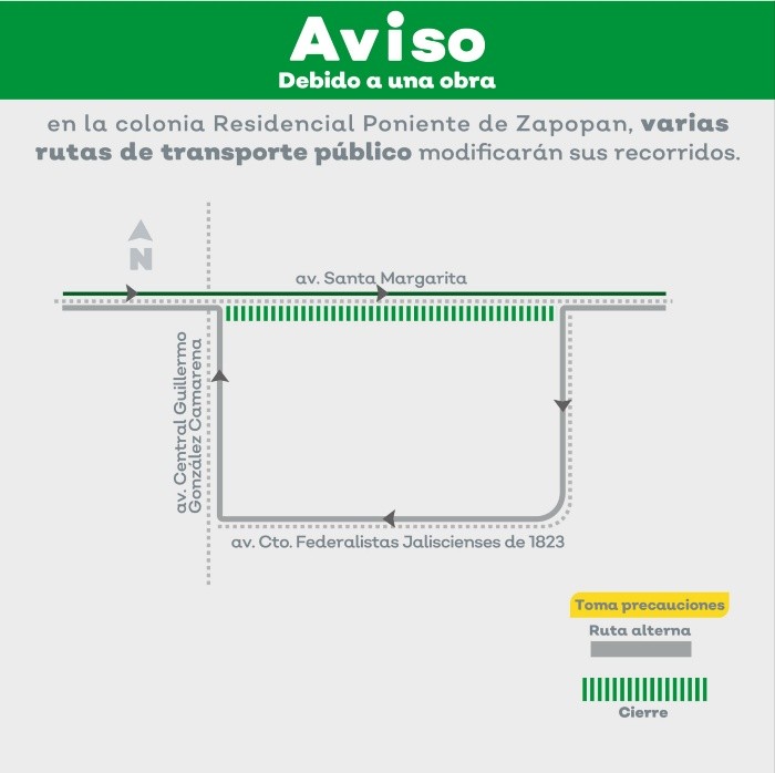 La Secretaría de Transporte Jalisco informó que algunas rutas de transporte público modificarán su recorrido a partir de este lunes 13 de mayo debido a un cierre temporal por una obra en la avenida Santa Margarita entre la av. Central Guillermo González Camarena y av. Federalistas Jaliscienses de 1823, en la colonia Residencial Poniente del municipio de Zapopan.Se trata de las rutas de transporte público C54, C84/ C85 y las Alimentadoras A-03 y A06 de Mi Macro Periférico las que modificarán sus recorridos, por una obra a partir de las primeras horas del lunes 13 de mayo y hasta que concluya la misma.Las rutas que modificarán su derrotero, serán durante su trayecto oriente-poniente sobre av. Santa Margarita en carriles de contraflujo, se desviarán hacia la av. Cto Federalistas Jaliscienses de 1823 para luego reincorporarse a su recorrido habitual en la av. Central Guillermo González Camarena. Cabe destacar que en el sentido de poniente-oriente no se modificarán ninguna de las rutas.NA