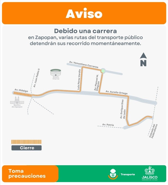 La Secretaría de Transporte Jalisco informó que el próximo domingo 24 de agosto varias rutas de camiones pararán sus recorridos en la Zona Metropolitana de Guadalajara con motivo de dos carreras deportivas. Por la Carrera Internacional Comude Guadalajara y Bomberos 10K se cerrarán las avenidas Circunvalación Agustín Yáñez y Mariano Otero.Por este evento deportivo las siguientes rutas se detendrán a partir de las 6:30 de la mañana del 24 de agosto:C104, C108, C109, C110 dos vías, C121A, C121B, C123-V1, C123-V2, C124, C74, C79, SITREN L1, T18, T18 Terranova, V02 y V03 de la Ruta López Mateos, T18, T18 Terranova, C127, T09-C1 y T09-C2.Por la Carrera Córrele al Mercado Zapopan se cerrarán las siguientes vialidades:De igual forma las rutas que se detendrán al paso del contingente serán a partir de las 6:30 am:C33 Auditorio, C33 Agua Fría, C43 Haciendas del Valle, C43 Valdepeñas, C44, C79, C121-A y T16B-C02.Las rutas que modificarán sus recorridos por la misma carrera serán:C135, T08 Américas, V04 de la #RutaLópezMateos, C72, C73, C84, C85 dos vías, T16B-C06, T16B-C07, T16B-C08, C81, C82, C136, T08-C01, T16A-C01, T16B, T16B-1, T16B-C01, T16B-C03, T16B-C04 y T16B-C05.NA