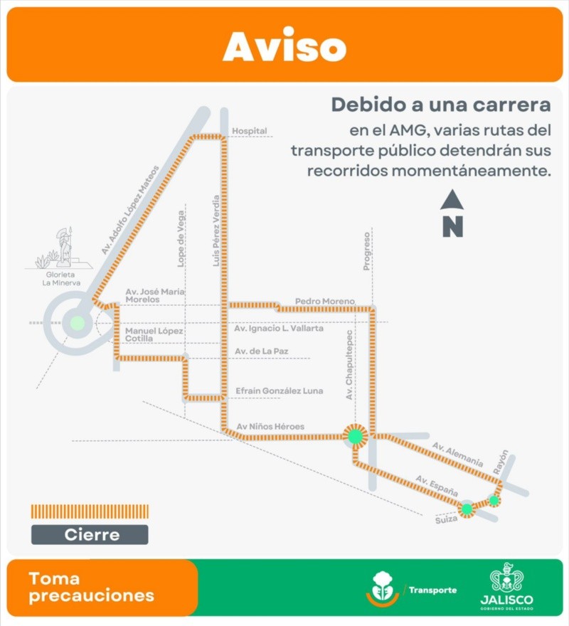 La Secretaría de Transporte Jalisco informó que el próximo domingo 3 de agosto a partir de las 6:30 de la mañana, algunas rutas de camiones pararán y otras modificarán sus recorridos momentáneamente debido a una carrera deportiva en el municipio de Guadalajara.Por dicho evento deportivo se cerrarán las siguientes vialidades: Avenida Adolfo López Mateos, Hospital, Luis Pérez Verdia, Lope de Vega, Avenida José María Morelos, Manuel López Cotilla, Pedro Moreno, Avenida Ignacio L. Vallarta, Avenida de la Paz, Efraín González Luna, Avenida Chapultepec, Avenida Niños Héroes, Avenida Alemania y Avenida España.C104, T11A, T11A-C01, T11A-C02 y T11A-C03, C124 y C136.C109, C110 dos vías, C121-A, C121-B, 79, C108, C123-V1, C123-V2, C79, SITREN L1, T06-2, T18 López Mateos, T18 Terranova V02 y V03 de la Ruta López Mateos, C74, C127, T09-C1, T09-C2, T10, T10-C01 y T10-C02, C17, T07-C01 y T07-C04.NA