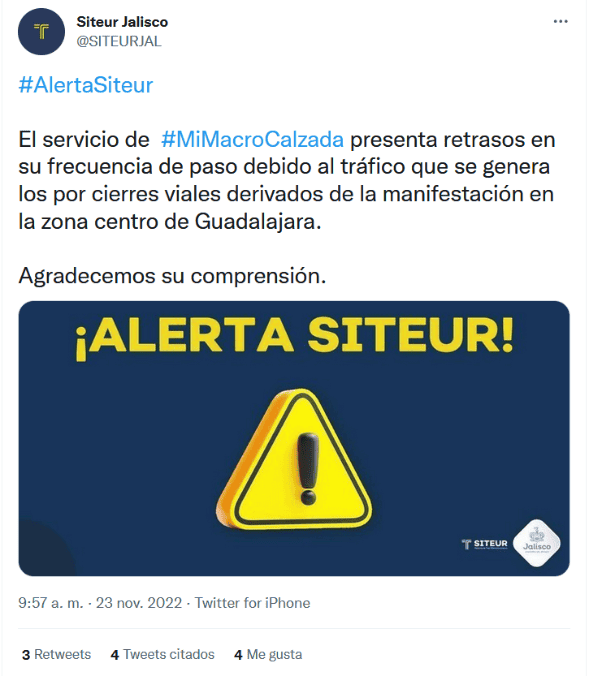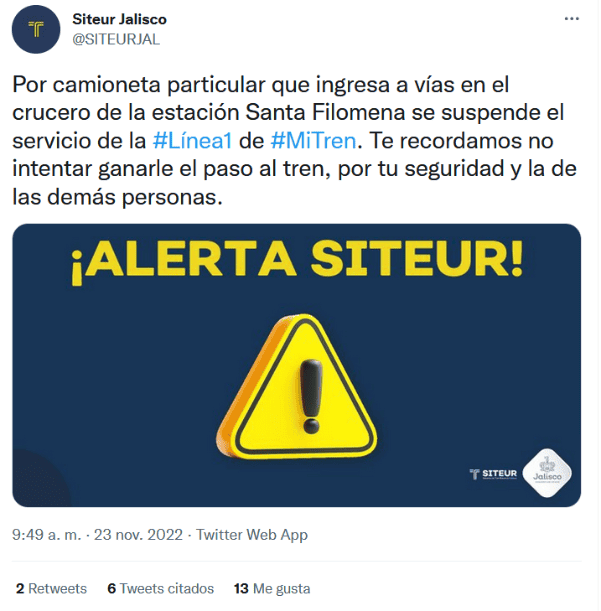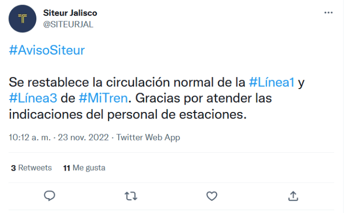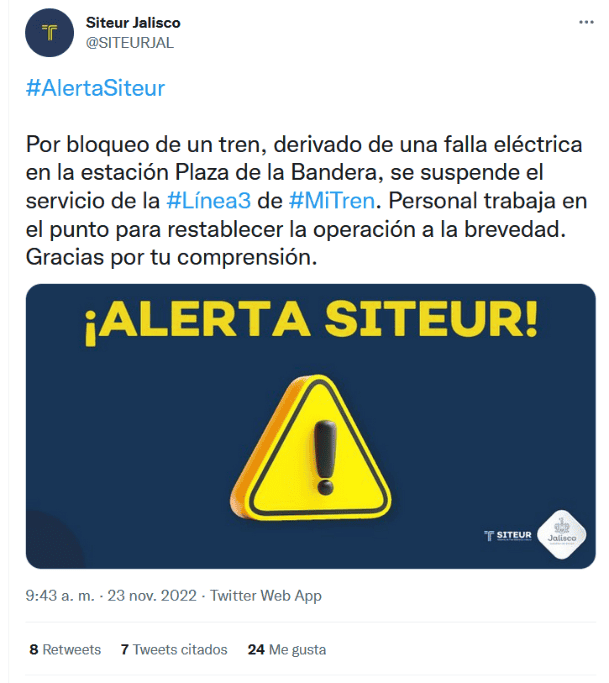 Previo a la megamarcha que convocó la Universidad de Guadalajara (UdeG) para este miércoles en el cuadro principal de la Zona Metropolitana de Guadalajara (ZMG), el Sistema de Tren Eléctrico Urbano (Siteur) informó que no hay servicio en la Línea 1 y Línea 3 del Tren Ligero. A través de redes sociales, el Siteur detalló, aproximadamente a las 9:43, que debido al "bloqueo de un tren, derivado de una falla eléctrica en la estación Plaza de la Bandera, se suspende el servicio de la Línea 3".Minutos después, el Siteur también mencionó que la Línea 1 del Tren Ligero suspendía su servicio, debido a una camioneta particular que ingresó a las vías, en el crucero de la estación Santa Filomena.Aunque no ha confirmado en sus redes la suspensión del servicio en la Línea 2, usuarios han comentado en estas mismas publicaciones que los trenes están parados desde hace minutos.Además, el Macrobús también presenta retrasos, aunque Siteur aclaró que se debe al tráfico que se genera por los cierres viales derivados de la manifestación. Después poco más de 30 minutos de suspensión del servicio, a las 10:12 Siteur informó que la Línea 1 y Línea 2 del Tren Ligero están funcionando nuevamente.GC