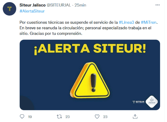 La mañana de este miércoles, el Servicio de Tren Eléctrico Urbano (Siteur) informó que se suspendieron los trayectos de la Línea 3 del Tren Ligero, debido a cuestiones técnicas.Sin dar mayor detalle, Siteur aseguró que "en breve se reanuda la circulación", pues personal especializado ya trabaja en el sitio para reparar la falla.Esto ha causado un sinfín de quejas entre usuarios del tren ligero, que acusan no les advirtieron sobre la suspensión del servicio, e incluso ahora están varados dentro de un vagón, esperando que se reanude el trayecto.Las molestias por el retraso han sido tantas, debido a los problemas que los usuarios tendrán por llegar tarde a la escuela o trabajo, que Siteur informó que pueden tramitar un justificante en el Centro de Atención a Pasajeros, en estación Juárez, de lunes a viernes, de 7: 00 a 22:00 horas.Actualización: El servicio ya fue restablecido, informó la dependencia.GC