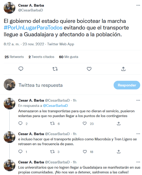 “El gobierno del estado quiere boicotear la marcha #PorUnLugarParaTodos evitando que el transporte llegue a Guadalajara y afectando a la población”, es como comenzó la denuncia en redes sociales por parte del director general del Sistema de Educación Media Superior (SEMS) de la Universidad de Guadalajara (UdeG), César Barba.Lo anterior, porque esta mañana se tiene previsto llevar a cabo una nueva marcha a la cual se invitó a toda la comunidad educativa, académica y administrativa, ante la decisión de las y los diputados de Jalisco de no otorgar los recursos suficientes en el Presupuesto de Egresos, “poniendo en riesgo 60 mil 500 espacios para que las y los jóvenes puedan continuar sus estudios de prepa y universidad”, según ha señalado el rector de la casa de estudios, Ricardo Villanueva.A través de su publicación, Barba Delgadillo aseveró que los transportistas “fueron amenazados para que no dieran el servicio, pusieron volantas para que no puedan llegar a los puntos de los contingentes, e incluso hicieron que el transporte público como Macrobús y Tren Ligero se retrasen en su frecuencia de paso”.Ante esta situación, dijo César Barba, de no poder llegar a alguno de los cinco contingentes que tienen previsto marchar este miércoles de distintos puntos de la ciudad, estudiantes y personal académico y administrativo se manifestará en sus propias comunidades. “¡No nos van a detener, saldremos a las calles!”, finalizó Barba Delgadillo.Esta no es la primera vez que la UdeG denuncia un “boicot” a sus protestas. En mayo, cuando se llevó a cabo la mega marcha “por la autonomía y un presupuesto digno”, autoridades de la UdeG también señalaron “diversos incidentes en el que los agentes viales impidieron que los autobuses llegaran a recoger a los universitarios, especialmente en la zona Sur de la ciudad como Tlajomulco, Santa Anita, Toluquilla y en el Norte, en las inmediaciones del Centro Universitario de Ciencias Económico Administrativas (CUCEA)”.GC
