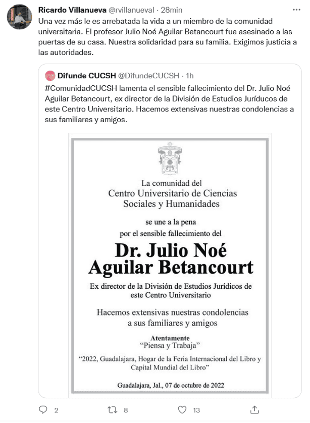 Luego de confirmar el asesinato de Julio Noé Aguilar Betancourt, maestro del Centro Universitario de Ciencias Sociales y Humanidades (CUCSH), el rector de la Universidad de Guadalajara (UdeG), Ricardo Villanueva, se pronunció al respecto.“Una vez más le es arrebatada la vida a un miembro de la comunidad universitaria. El profesor Julio Noé Aguilar Betancourt fue asesinado a las puertas de su casa. Nuestra solidaridad para su familia”, expresó el rector a través de sus redes sociales.Julio Noé, de 52 años, fue asesinado anoche cuando estacionaba su vehículo en la cochera de su casa, ubicada en el cruce de las calles Herramienta y Esmeril, en la colonia Lázaro Cárdenas de Guadalajara. Ante este hecho, Villanueva Lomelí extendió su exigencia a las autoridades estatales para que se haga justicia por el homicidio.De acuerdo con la información preliminar de la Policía de Guadalajara, corporación que atendió el hecho, de los causantes solo se supo que “eran dos hombres jóvenes” quienes huyeron pie a tierra hacia una de las calles contiguas, donde ya eran esperados por un vehículo en el cual se dieron a la fuga.El CUCSH también envió un mensaje en el cual lamentó el sensible fallecimiento del doctor Aguilar Betancourt, ex director de la División de Estudios Jurídicos de este Centro Universitario, en el cual impartía sus clases. “Hacemos extensivas nuestras condolencias a sus familiares y amigos”, añadió la publicación.Apenas el pasado 29 de septiembre, miles de estudiantes, personal académico y administrativo de la UdeG salió a las calles para exigir a las autoridades estatales las acciones necesarias para devolver la seguridad y la paz en Jalisco, luego de la desaparición del joven Miguel Soto, alumno del Centro Universitario del Centro Universitario de Ciencias Económico-Administrativas (CUCEA), de quien no se sabe nada desde el pasado 15 de septiembre.gc