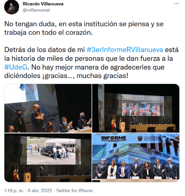 Tras los gritos ¡no estás solo!, por parte de la comunidad universitaria que acudió a su tercer informe de actividades, Ricardo Villanueva Lomelí, rector de la Universidad de Guadalajara (UdeG), recordó que: "si se meten con uno, se meten con todos. Y eso hay que entenderlo".Lo anterior, luego de la proyección de un video sobre las marchas realizadas en meses pasados por la Universidad para exigir autonomía presupuestal, como protesta por el recorte de 140 millones de pesos que se tenían etiquetados para el Museo de Ciencias Ambientales."Hasta cuándo vamos a entender que esta lucha que estamos dando los universitarios, no es por pesos y centavos, ni por vigas y ladrillos. Esta lucha es por todos los jóvenes y niños de Jalisco que merecen una oportunidad de estudio para aspirar a un mundo y una vida mejor".El rector agradeció la solidaridad de todos los universitarios para defender la autonomía presupuestaria de la universidad. "Quiero agradecerles todas las asoleadas en cada marcha a Casa Jalisco. También debo agradecer las firmas de sus familias, y las firmas de todas las familias de los jaliscienses que nos han apoyado levantando su voz a través de las cartas que le hemos estado enviando al Gobernador".Añadió que va por buen camino la estrategia jurídica principal de la Universidad para evitar que el Ejecutivo reoriente la bolsa etiquetada para el museo. "Vamos a ganar ese juicio porque tenemos la razón".En los primeros tres años de la administración de Villanueva Lomelí, se han invertido dos mil 774 millones de pesos en obras. Además, se realizaron mil 253 obras y se concluyeron 320.Se construyeron más de 220 mil metros cuadrados; se gestionó la donación de casi un millón 400 mil metros cuadrados y se regularizaron más de tres mil 300 metros cuadrados de terrenos.Para admitir a cien por ciento de aspirantes a preparatorias se construyeron 215 aulas.Con las ganancias de empresas universitarias se construyeron aulas en las preparatorias 21 y 22, en Zapopan y Tlaquepaque, respectivamente.GC