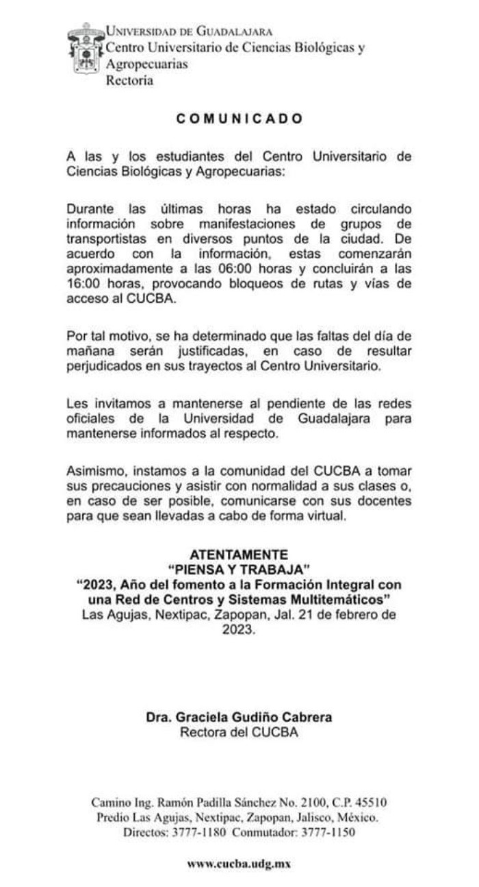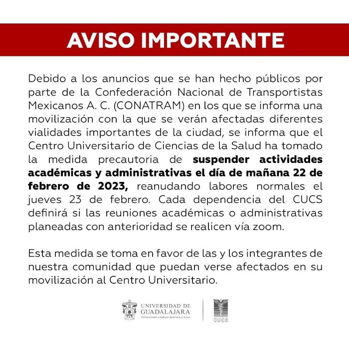 Debido a las manifestaciones que tendrán lugar este miércoles por parte de la Confederación Nacional de Transportistas mexicanos A.C. (Conatram), la Universidad de Guadalajara emitió un comunicado en el que anuncia que las clases en el Centro Universitario de Tonalá, así como en el CUCS, las clases se suspenderán, con la opción de que las reuniones académicas o administrativas planeadas antes puedan llevarse a cabo de manera virtual, esto debido a que se prevé que las movilizaciones afecten directamente el ingreso al CUTonalá.De igual manera, se anunció que en el CUCBA los alumnos tendrán sus faltas justificadas en caso de que resulten afectados por los bloqueos al tránsito.Sobre las movilizaciones, la Conatram ha recalcado que no se realizarán bloqueos en las vialidades, pero sí se generará tráfico debido a que entrarán en sus transportes a varios puntos de la ciudad.El motivo de la manifestación, aseguró la la Conatram, es por lo que consideran como cobros excesivos en casetas y abusos de autoridades de la Secretaría de Infraestructura, Comunicaciones y Transportes (SICT).JM