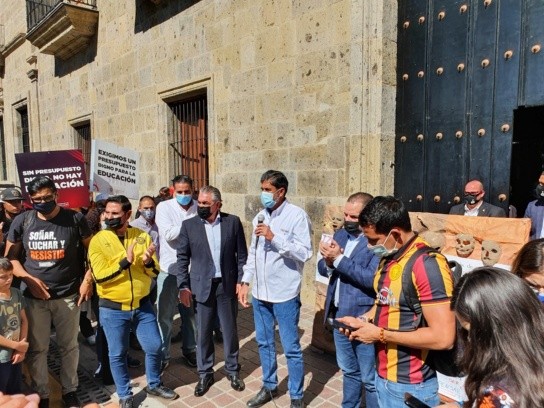 Estudiantes de la Universidad de Guadalajara (UdeG) se manifestaron frente al Congreso de Jalisco, en la vigésimo sexta "Caminata por la Autonomía, Salud y Educación". Al grito de "ya paguen" y "lacayos", el grupo de estudiantes y maestros de la preparatoria 16 llegaron hasta las puertas del recinto del Poder Legislativo donde comparecían funcionarios estatales como el secretario general de gobierno, Enrique Ibarra y el Jefe de Gabinete Hugo Luna, en el inicio de la glosa del tercer informe de actividades del gobernador.Jesús Palafox Yáñez, secretario general del Sindicato de Trabajadores Académicos de la Universidad, acusó a los diputados de Movimiento Ciudadano y de Acción Nacional de funcionar como apéndice y "agachones" del gobierno estatal. Demandó que en la discusión del presupuesto del próximo año le den un incremento real a la casa de estudios, además de la restitución de los 140 millones de pesos recortados al Museo de Ciencias Ambientales."Que no nos engañen con un supuesto incremento extraordinario, necesitamos un incremento ordinario, en el proyecto de presupuesto si se fijan es el mismo que el del año pasado y están diciendo mentiras. Exigimos un presupuesto suficiente y digno para la Universidad", argumentó.Los manifestantes fueron atendidos por los diputados Hugo Contreras del PRI y Enrique Velázquez de Hagamos; refirieron que este jueves los integrantes de la Junta de Coordinación Política se reunirán con el rector Ricardo Villanueva para abordar el tema del presupuesto 2022.Los universitarios se retiraron y dejaron pancartas y un mural en el ingreso del edificio del Poder Legislativo.GC