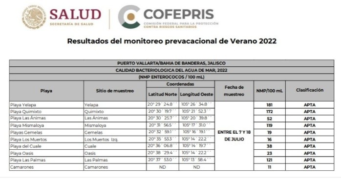 La Comisión Federal para la Protección contra Riesgos Sanitarios (Cofepris), sanitarias estatales y la Red Nacional de Laboratorios de Salud Pública analizaron dos mil 098 muestras de agua de mar en 290 playas de 75 destinos turísticos.De las playas estudiadas en los 17 estados costeros para saber si representan o no un riesgo para la salud, un total de 287 playas son aptas para uso recreativo. Lo que se revisa es la presencia de la bacteria Enterococcus faecalis. Las muestras de agua analizadas no deben rebasar los límites establecidos de 200 enterococos en 100 ml de agua. En Jalisco la Cofepris analizó 10 de las principales playas del Estado: Yelapa, Quimixto, Las Ánimas, Mismaloya, Gemelas, Los Muertos, Cuale, Oasis, Las Palmas y Camarones.El muestreo del agua en dichas playas se tomó entre el 7 y 18 de julio, según informó la dependencia.Los resultados en realidad son positivos, pues todas resultaron aptas para uso recreativo, a diferencia de otros estados costeros que sí tuvieron un nivel de contaminación que rebasó los límites. De las 10 playas de la zona de Puerto Vallarta y Tomatlán, las que tienen mejor calidad del agua respecto de las bacterias son la Playa Camarones, seguida de la Playa de Los Muertos y las Playas Gemelas.“Durante el periodo prevacacional de verano 2022 los análisis de laboratorio realizados en más de dos mil muestras de agua de las playas de mayor afluencia pública de los principales destinos turísticos del país, arrojaron como resultado que 287 playas son aptas para uso recreativo de un total de 290 playas vigilada”, dijo la Cofepris respecto del muestreo nacional.Las playas que fueron catalogadas como “No aptas” fueron la Playa Hornos, la Playa Suave y Manzanillo, ubicadas en Acapulco, Guerrero.Lo anterior, señaló el organismo, “debido al riesgo a la salud que representa la presencia de enterococos en una concentración mayor a 200 enterococos (NMP/100mL), el cual es el límite establecido por esa Comisión Federal en seguimiento a la normativa de la Organización Mundial de la Salud (OMS)”.