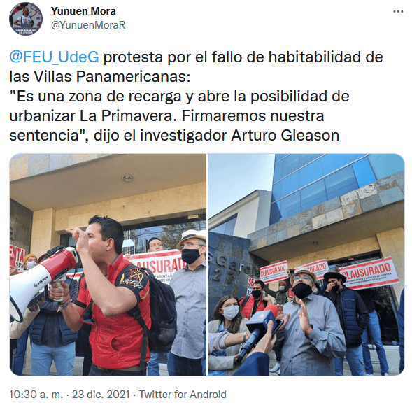 Hace tres días, el Tribunal de Justicia Administrativa de Jalisco (TAE) expidió el certificado de habitabilidad para la Villa Panamericana, por ello, la Federación de Estudiantes Universitarios (FEU), junto con académicos y colectivos medioambientales, "clausuraron" (de manera simbólica) el edificio del TAE.Arturo Gleason, académico de la Universidad de Guadalajara, resaltó que hay cuatro razones para decir que el proyecto va en contra de la preservación del medio ambiente.La primera es que es zona de recarga acuífera, es decir, recibe agua de lluvia para penetrar a los subsuelos. Destacó que 30% de la Zona Metropolitana de Guadalajara se abastece de agua de acuíferos."En esta "taza" no se va a filtrar, pero sí se va a acumular. Quienes compren ahí se van a tener que comprar una lancha porque se va a inundar", añadió Gleason.Además, señaló que hay fosas sépticas, las cuales colapsarán, tal como pasó durante los Juegos Panamericanos.Pero también, señaló que con esto se abre la posibilidad de urbanizar el Bosque de la Primavera "y con ello firmaremos nuestra sentencia".Por su parte, Francisco González, de la Asociación en Preservación de los Derechos Medioambientales del Estado, agregó que los mismos jugadores, durante la justa deportiva, dieron testimonio "de lo horrible que era vivir ahí".Resaltó que, aunque el aval que dio el juzgador Laurentino López Villaseñor se hizo apegado a las leyes y normas, estas son viejas y laxas.Arturo Mendoza Montaño, integrante de colectivos por la defensa de Huentitán, dijo que "los bienes del pueblo los usan para beneficiar a los privados. Es el mismo modus operandi en todos lados".Mientras que Javier Armenta, presidente de la FEU, añadió que "los jueces son parte de la mafia inmobiliaria. Fueron nombrados por el partido en el poder y no mueven un dedo si no dice el gobernador. Esto es un acto de corrupción que compromete al medioambiente de los que viven en el bajío y la ZMG".Añadió que expondrán los acuerdos y el nombre del juez para que toda la ciudadanía se entere.Al final procedieron a hacer la clausura, colocando calcomanías en las puertas y ventanas.GC