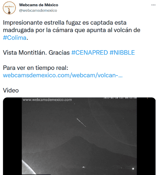 La madrugada de este lunes se observó una estrella fugaz sobre el volcán de Colima. Este fenómeno fue captado por las cámaras del Centro Nacional de Prevención de Desastres (Cenapred) y después compartida por Webcams. El paso de la estrella fugaz fue captada en punto de las 00:51 horas de hoy lunes. La magnífica imagen fue tomada desde una cámara colocada en la comunidad de Montitlán, del municipio de Cuauhtémoc, Colima. No es la primera vez que se registra un fenómeno así en el Volcán de Colima. En diciembre del 2020, también se vio el paso de una estrella fugaz sobre el Volcán de Fuego, alrededor de las 02:00 horas. Una estrella fugaz es como se le conoce popularmente a un cuerpo menor del sistema solar compuesto de polvo y hielo o rocas que atraviesa la atmósfera de la Tierra.GC