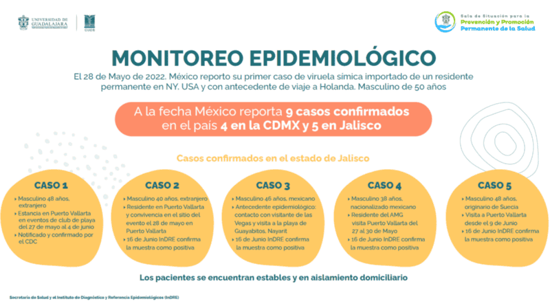 Por el surgimiento de nuevas enfermedades, como la Viruela del Mono, la Universidad de Guadalajara (UdeG) instaló la Sala de Situación para la Prevención y Promoción Permanente de la Salud, donde estarán realizando pruebas para detectar este padecimiento.José Francisco Muñoz Valle, rector del Centro Universitario de Ciencias de la Salud (CUCS), informó que ya tienen pruebas suficientes para realizar en caso de ser necesario. Además, buscarán trabajar con la Secretaría de Salud Jalisco (SSJ) para ayudar con la detección de casos de Viruela del Mono, como en su momento lo hicieron con el COVID-19.En la UdeG cuentan con tres ensayos tipo PCR, uno de los cuales servirá para detectar si corresponde a variante África Occidental y Congo Central. Estas pruebas se harán con muestra de lesiones o costras de cutáneas de aquellos que consideren están infectados.“Ya tenemos capacidad de realizar las pruebas. Se puede una cantidad pequeña, pero podemos incrementar la capacidad si es necesario”, señaló el rector.Recordó que la transmisión entre personas se produce por contacto estrecho con material infeccioso de lesiones cutáneas de una persona infectada o a través de gotículas respiratorias de objetos contaminados. Pero también que la mayoría de los casos presentan un cuadro clínico leve.Destacó también que la necesidad de la vacunación tendrá que valorarse en un futuro de acuerdo a la ocurrencia de casos, sin embargo, recordó que el riesgo de contagio en población general es bajo solo cuando hay relación estrecha, por lo que hay que tener tranquilidad.José Ángel Regla Nava, virólogo - profesor investigador del CUCS y miembro de la Sala, resaltó que hasta el momento no hay ninguna muerte asociada a la viruela símica, y que los primeros síntomas son dolor de cabeza, fiebre, agotamiento, ganglios inflamados, dolor de espalda, escalofríos, sarpullido y dolor muscular.Mientras que de uno a tres días después comenzarán a aparecer erupciones en la cara que se extenderán al cuerpo.Dentro de las secuelas después de resolver la enfermedad es la presencia de cicatrices. Una vez que ya se cayeron las costras, la persona ya no es contagiosa.Añadió que las personas vacunadas contra viruela antes del año de 1975 tienen protección cruzada contra la viruela símica de hasta 85 por ciento. Es decir, la vacuna les da inmunidad de largo plazo, por lo que la sintomatología sería leve.A la fecha, México ha reportado nueve casos de la viruela del mono: cuatro en la Ciudad de México y cinco en Jalisco.GC