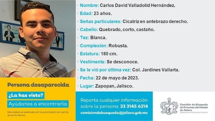 Familiares y amigos de cinco jóvenes desaparecidos esta semana en Zapopan preparan una manifestación.Han pasado ya tres días y nada se sabe de los hermanos Valladolid Hernández: Itzel Abigail de 27 años y Carlos David de 23 años ambos iban a trabajar a un callcenter en la colonia Jardines Vallarta en Zapopan y hasta el momento no se sabe de ellos.Su última ubicación fue la colonia vecina de San Juan de Ocotán en el mismo municipio. Viajaban en un auto Volkswagen Jetta Sport, modelo 2016, con placas LKW026A.También se desconoce el paradero de José Alfredo Salazar Ventura.Como ellos desapareció también Arturo Robles Corona, de 30 años, quien fue visto por última vez el mismo 22 de mayo, también en la Colonia Jardines Vallarta.De acuerdo con la información preliminar, Itzel, Carlos David y Arturo trabajaban en un callcenter en la calle Víctor Hugo, en la colonia Jardines Vallarta y sus familiares no han podido contactar con ellos. Familiares de los hermanos Valladolid rastrearon su última ubicación, la cual marcaba avenida Vallarta entre la Privada López Cotilla y Madero, en la colonia San Juan de Ocotán, en Zapopan.Los hermanos Itzel Abigail y Carlos David Valladolid Hernández, Arturo Robles Corona y José Alfredo Salazar Ventura fueron vistos por última vez cuando se dirigían a trabajar a un callcenter ubicado en la colonia Jardines Vallarta, en Zapopan.Por otra parte también se encuentra desaparecido Carlos Benjamín García Cuevas, de 31 años, quien fue visto por última vez el 20 de mayo pasado en la colonia Paseos del Sol, según su ficha de búsqueda.Por la desaparición de los cuatro jóvenes, amigos y familiares han convocado a una manifestación para exigir su localización inmediata con vida.La marcha se llevará a cabo el día de mañana viernes a las 17:00 horas, y se tiene planeado que parta de la Glorieta de las y los desaparecidos hacia Casa Jalisco.Al respecto, la Fiscalía Estatal emitió un comunicado para informar que ya realizan las investigaciones correspondientes para dar con el paradero de los cuatro jóvenes.De acuerdo con la dependencia, “de los actos de investigación se desprende que Itzel, Carlos David y Arturo ya no retornaron a sus domicilios después de presentarse a trabajar en un callcenter en Zapopan”, por lo cual sus familiares interpusieron las denuncias correspondientes.“Elementos de la Fiscalía Especial en Personas Desaparecidas, en coordinación con peritos del Instituto Jalisciense de Ciencias forenses, realizaron un cateo el 24 de mayo, en la finca donde fueron vistos por última vez, en la que se obtuvieron diversos indicios que se integraron a la carpeta de investigación.También se ha llevado a cabo una serie de diligencias consistentes en entrevistas a personas cercanas y posibles testigos”, aseveró la dependencia sin dar mayores informes sobre los avances.También confirmó que se llevan a cabo diligencias por la desaparición de Carlos Benjamín, “fue visto por última vez en su domicilio particular ubicado en la colonia Paseos del Sol”, refirió la dependencia.Familiares de los cuatro jóvenes presentaron los reportes correspondientes para la emisión de sus fichas de búsqueda con el objetivo de que la ciudadanía pueda ofrecer algún dato que pueda ayudar a dar con su paradero. Es de tez blanca, complexión media, mide 1.58 metros, cabello obscuro y lacio a la altura de los hombros, perforación en la nariz y tres tatuajes: uno en la pierna izquierda de una flor de loto; en el brazo derecho un cactus con flores y en el antebrazo izquierdo una mariposa. Hermano de Itzel, es de tez morena claro, complexión robusta, cabello obscuro rizado y mide 1.80 metros de estatura, cejas pobladas, cicatrices en el brazo y antebrazo derecho. Es de tez morena clara, cabello negro quebrado y largo, tiene perforaciones en ambos lóbulos, en nariz y pectorales, así como un tatuaje de un par de alas que abarca sus dos piernas. Vestía playera de manga corta, pantalón y tenis negros, además de llevar una cadena en el cuello. Es de tez blanca, cabello ondulado corto castaño claro, de complexión atlética y mide 1.75 metros. Tiene una cicatriz en la frente y la última vez que se le vio llevaba short y tenis converse azul marino. Cualquier información del paradero de ambos, las personas pueden comunicarse de manera anónima al número de la Fiscalía Especial en Personas Desaparecidas al 3331456314. Tiene 37 años y tez blanca. Tiene ojos color miel, un tatuaje de un lobo en el brazo izquierdo y de un tigre en el brazo derecho. Vestía pantalón azul obscuro y playera azul marino. De acuerdo con el Registro Nacional de Personas Desaparecidas o No Localizadas (RNPDNO), en Jalisco hay 14 mil 978 personas de quienes se desconoce su paadero, de las cuales seis mil 984 personas tenían entre 20 y 35 años al momento de su desaparición, edades entre las cuales se encuentran Carlos, Abigail, David y Arturo.