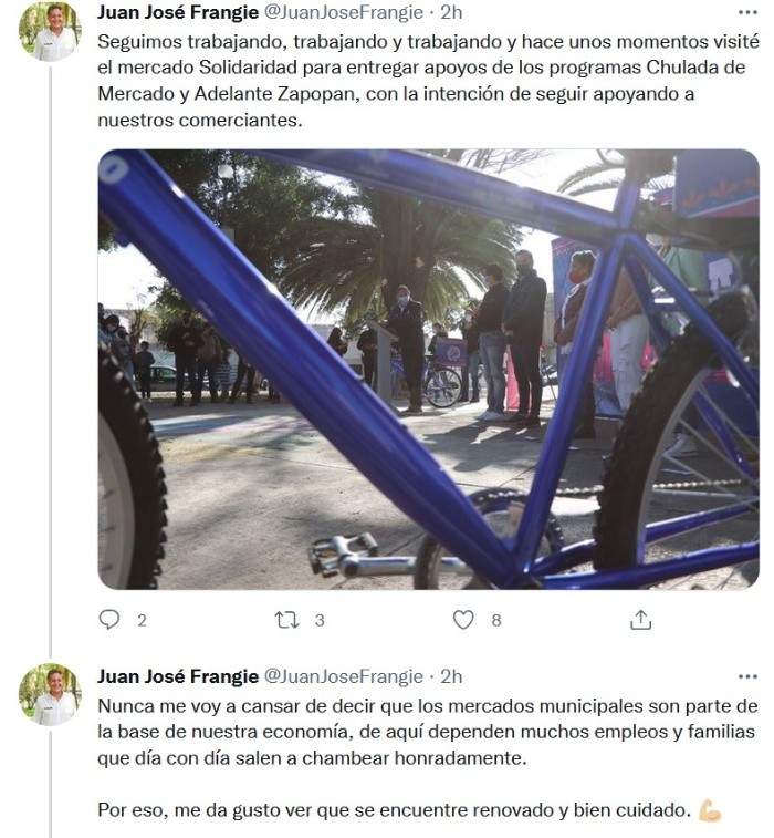 El presidente municipal de Zapopan, Juan José Frangie, presentó la remodelación del mercado Solidaridad como parte del programa "Chulada de Mercado", además de encabezar la entrega de dos bicicletas para facilitar la venta de productos a domicilio y de esta manera apoyar a la reactivación económica en la zona.“Los mercados y los tianguis no estaban sujetos muchas veces a créditos o a ciertos beneficios, y partí de la base de que lo primero que teníamos que hacer era dignificar los mercados, no nada más era pintarlos, era darle una imagen, era darles esa limpieza y atención que merecen”, resaltó Frangie.El alcalde destacó que con estas intervenciones se fomenta la reactivación de los mercados como espacios de convivencia y reunión.“Hoy vemos este mercado renovado con 'Chulada de Mercado'. Era la parte más importante, brindarle a esa gente la confianza de que está llegando a un lugar limpio, un lugar con productos de calidad, un lugar donde realmente nos preocupamos por darle el mejor servicio”, agregó.Los trabajos consistieron en la renovación de vestimentas, señalética, lonas en las entradas y salidas, nomenclatura de locales, así como la entrega de volantes y kits para comerciantes que incluye playeras, bolsas de tela, gorras y mandiles.La señora Patricia Brambila, mejor conocida en la comunidad como "doña Chapis", agradeció la intervención en nombre de las y los locatarios del mercado. Destacó que después de la crisis ocasionada por la contingencia sanitaria es esperanzador sentirse escuchados y atendidos.“Este mercado para nosotros significa mucho porque este mercado no es solo nuestro lugar de trabajo, somos una gran familia que nos apoyamos en las buenas y en las malas y agradecemos la visita y el interés de todas las personalidades que hoy están aquí con nosotros apoyándonos”, declaró.Desde la pasada administración hasta el día de hoy, son nueve los mercados beneficiados con la recepción de bicicletas: Ciudad Granja, Constitución, Las Fuentes, Francisco Sarabia, Santa Ana Tepetitlán, Abastos, Lázaro Cárdenas, Tesistán y Auditorio.La campaña "Chulada de Mercado" se lanzó en 2020, con el fin de promover la economía local y el consumo de productos en los mercados municipales a través de la renovación de estos espacios.JM