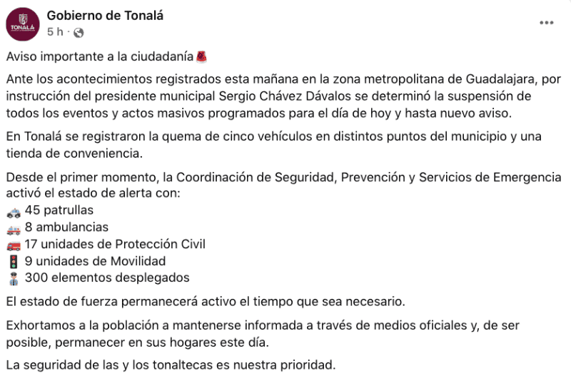 El Gobierno Municipal de Tonalá anunció la suspensión de todos los eventos y actos masivos programados para este sábado, como medida preventiva ante los hechos violentos registrados durante la mañana en la Zona Metropolitana de Guadalajara.
