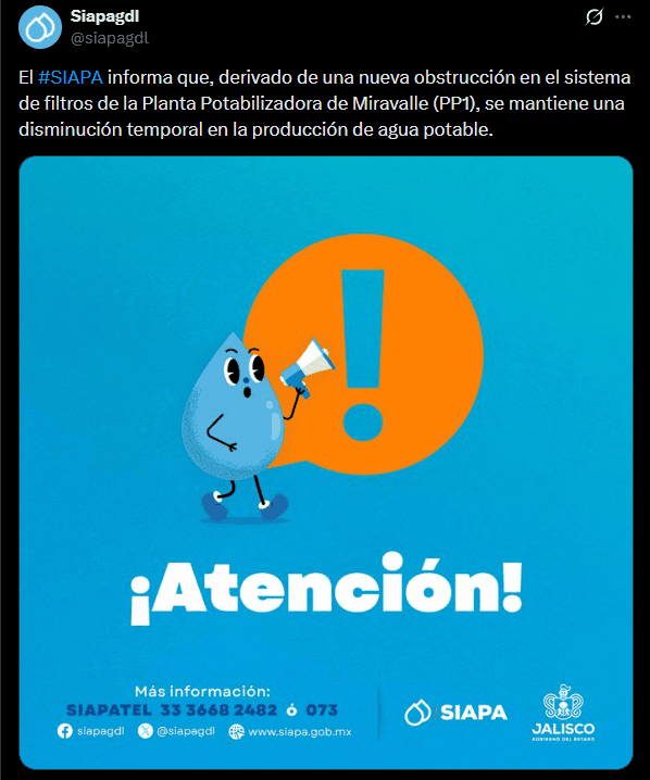 El Sistema Intermunicipal de los Servicios de Agua Potable y Alcantarillado (SIAPA) informó que se registra un corte en el suministro de agua potable en diversas colonias del municipio de San Pedro Tlaquepaque.De acuerdo con el organismo, la afectación se debe a una nueva obstrucción en el sistema de filtros de la Planta Potabilizadora de Miravalle, situación que ha provocado una disminución temporal en la producción de agua.Ante este escenario, el SIAPA señaló que el servicio será suspendido en las zonas afectadas y que el restablecimiento del suministro se realizará de manera gradual, conforme avancen los trabajos de recuperación del Tanque Álamo Regulador. De forma paralela, el organismo ha reforzado el operativo de abastecimiento emergente para apoyar a la población afectada.Las colonias con afectaciones son:La normalización total del servicio está prevista para el transcurso del miércoles 11 de febrero. En caso de cualquier duda o aclaración, el SIAPA pone a disposición los siguientes medios para que resuelvas tus preguntas.MF