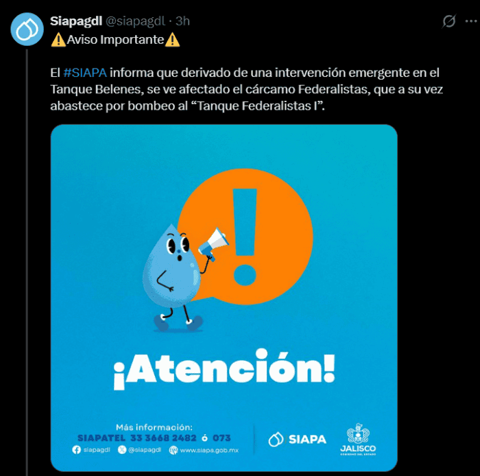 Fue a través de sus redes sociales donde el SIAPA informó que, debido a una intervención emergente en el Tanque Belenes, resultó afectado el funcionamiento del cárcamo Federalistas, el cual a su vez suministra agua mediante bombeo al Tanque Federalistas I.