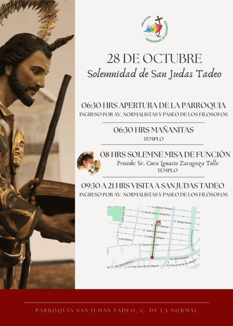 Cada 28 de octubre, Guadalajara se viste de fiesta para honrar a San Judas Tadeo, a quien se le considera como el santo de las causas difíciles y durante esta celebración se congregan miles de fieles que acuden con gran devoción, transformando las calles y la Parroquia de San Judas Tadeo, en la colonia Colinas de La Normal, en un epicentro de fe y tradición. Esta festividad es una de las más importantes del calendario religioso de la ciudad y mantiene viva una tradición que se remonta a décadas atrás.Su conmemoración inicia varios días antes (desde el 19 de octubre), con actividades que incluyen misas, peregrinaciones y actos culturales, creando un ambiente de intensa participación comunitaria. Para muchos, este día representa una oportunidad de fortalecer la fe, pedir favores y agradecer las bendiciones recibidas durante el año, familias enteras se trasladan a la parroquia para formar parte de la ceremonia y participar en la verbena popular que acompaña los festejos.De acuerdo con la información compartida, este año, la misa principal se llevará a cabo a las 8:00 a.m., marcando el punto culminante de las festividades, sin embargo, las actividades comienzan desde muy temprano con las tradicionales mañanitas a las 6:30 a.m.La Parroquia de San Judas Tadeo, ubicada en Paseo de los Filósofos 1426, se convierte en el corazón de esta celebración, recibiendo a miles de personas de la ciudad y de municipios cercanos. Durante todo el día, se observa un flujo constante de peregrinos que llegan a pie, en transporte público o en vehículo particular, todos con el mismo objetivo: participar de la fe y la tradición. YC