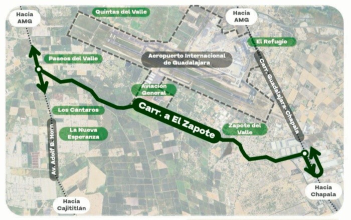 Este jueves 8 de enero, fue formalmente inaugurada la modernización de la Carretera a El Zapote, obra que mejorará la conectividad entre Adolf B. Horn y Carretera a Chapala, así como al corredor que conecta con El Salto.La obra de poco más de 45 mil metros cuadrados de pavimento tiene una inversión de 149.5 millones de pesos, que incluyen, además de la carpeta de rodamiento, la construcción de dos mil 607 metros cuadrados de banquetas, 237 luminarias, señalización vertical y horizontal y la incorporación de 111 árboles.“En esta inversión histórica, además, la Zona Valles pudo tener una inversión de más de 700 millones de pesos, y solo en esta carretera, cerca de 150 mil millones que pudimos invertir de manera multianual. ¿Qué significa? Que es una carretera que no solo se reconstruyó desde sus bases, sino que también va a poder tener mantenimiento permanente en los próximos dos años, para que se encuentre en buen estado”, dijo el alcalde del municipio, Gerardo Quirino Velázquez, durante la inauguración de la intervención.Por otra parte, afirmó, buscará reunirse en los próximos días con el gobernador de Jalisco, Pablo Lemus Navarro, para presentarle la propuesta que permita ampliar esta vía a cuatro carriles (dos de ida y dos de vuelta), considerando la importancia que tendrá para las conexiones con el Aeropuerto Internacional de Guadalajara, y el nuevo ingreso que se construirá por Adolf B. Horn."En este gobierno hemos sabido ponernos de acuerdo para poner a las personas en el centro. Me da mucho gusto, y además mucho orgullo de decirles que por segundo año consecutivo, sacamos, por ejemplo, un presupuesto por unanimidad de todas las fuerzas políticas. Aquí no hay colores, aquí lo que hay es un compromiso con la gente de nuestro municipio y todos sumamos esfuerzos y trabajo en equipo", manifestó Quirino Velázquez.René Caro, coordinador General de Gestión del Territorio del ayuntamiento de Tlajomulco, destacó que una de las apuestas más importantes de este gobierno municipal es la infraestructura, con una inversión histórica de más de dos mil millones de pesos el año pasado "y que seguirá el mismo ritmo en este año 2026"."Y uno de los ejes más importantes de esta apuesta por la infraestructura es precisamente la infraestructura de las vialidades en las que nos movemos, y estamos hablando de vialidades que mejoran la vida de las personas de las localidades, en este caso de Zapote del Valle y todas las personas que habitan en esta zona, pero también de la movilidad que tiene que ver con el acceso al transporte público, y por supuesto, el acceso a los empleos, el acceso a las empresas a las industrias, que particularmente en este corredor de Carretera a Chapala tiene una presencia muy importante", destacó el coordinador.Asimismo, reafirmó que la zona tiene una gran posibilidad de conectarse de una manera más segura y eficiente “con toda la actividad de la avenida Adolf B. Horn y la Carretera a Chapala, recientemente intervenida por el Gobierno del Estado”."Esta avenida la rehabilitamos completamente, la reconstruimos totalmente desde la base la estructura del pavimento. Los asfaltos son nuevos, pero no solo eso, esta vialidad también le funciona a las personas que habitan por aquí, ya tienen todas las condiciones y una realidad urbana. Esto es, ya que tiene banquetas, accesibles, por supuesto, tiene crucero seguros, tiene alumbrado, tiene arbolado, de manera que funcione tanto para las personas que puedan cruzar y que puedan caminar por la vialidad, como, por supuesto, todos los vehículos del transporte público, la carga, las industrias, que puedan hacer uso seguridad de esta vialidad", finalizó el coordinador.Las zonas beneficiadas gracias a esta intervención son:Previo al corte del listón inaugural la obra fue bendecida por el sacerdote de la comunidad, originario de Zapote del Valle, el padre Juan Carlos Pérez López.Durante la inauguración de la obra, además, estuvieron presentes representantes vecinales y ejidales, así como de empresarios clave de la zona, quienes coincidieron en la importancia que tiene esta vía no solo para la movilidad de las familias con puntos clave de Concepción del Valle, sino también con puntos estratégicos de la ciudad como los ya mencionados.A continuación, te decimos más detalles de la obra:Modernización de la Carretera a El Zapote – Corredor Chapala • Proyecto: Modernización integral de la Carretera a El Zapote • Corredor estratégico: Corredor Chapala • Ubicación: De Av. Adolf B. Horn Jr. a la Carretera Guadalajara–Chapala, Zapote del ValleLas cifras: • Longitud intervenida: 8.1 kilómetros • Monto de inversión: ~149.5 millones de pesos • Tipo de obra: Intervención integral (no obra parcial) • Horizonte de mantenimiento: 3 años continuosPlan estratégico • Conexión directa con Adolf B. Horn y Carretera Guadalajara–Chapala • Ruta clave para la movilidad diaria de miles de personas • Unión de la Zona Valle con el sur de la ciudad • Fortalecimiento del ingreso sur y entorno del aeropuerto • Infraestructura permanente para movilidad, seguridad y desarrollo • Aporte municipal a la infraestructura metropolitana, a la altura de eventos internacionalesAcciones realizadas • Reconstrucción total del pavimento asfáltico • Limpieza y desmonte de taludes • Correcciones geométricas para mayor seguridad vial • Construcción de banquetas • Incorporación de nuevo alumbrado público • Señalamiento horizontal y vertical • Colocación de arbolado urbano • Programa de mantenimiento continuo* * * Mantente al día con las noticias, únete a nuestro canal de WhatsApp * * * AS