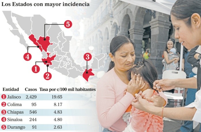 El subsecretario de Integración Sectorial y Desarrollo de la Secretaría de Salud, Eduardo Clark García, informó que Jalisco se encuentra entre las once entidades donde se intensificará la vacunación contra el sarampión en personas de 13 a 49 años que no cuenten con el esquema completo, debido a que acumulan la mayor parte de los casos en todo el país.Durante la conferencia matutina de la Presidenta Claudia Sheinbaum, el funcionario detalló que la meta es acelerar la aplicación de dosis hasta alcanzar 2.5 millones de vacunas semanales, con el fin de cortar cadenas de transmisión y contener brotes activos.El subsecretario explicó que, a poco más de un año del primer caso registrado en Chihuahua, el país acumula 9 mil 487 casos, 410 más que la semana anterior.Sin embargo, el funcionario subrayó que la incidencia se mantiene relativamente baja gracias a las altas coberturas históricas de vacunación en México."En México no hay movimientos antivacunas y la incidencia de sarampión es baja", dijo.Advirtió que "Si no nos hubiéramos vacunado históricamente, un virus como el sarampión podría generar cientos de miles, si no es que millones de contagios".El subsecretario recordó que el control del brote en Chihuahua fue posible tras la aplicación de 1.8 millones de dosis, lo que permitió reducir los casos activos hasta prácticamente eliminarlos en 2026. Ese modelo, dijo, es el que se busca replicar en el resto del país.Actualmente, el sistema nacional de salud dispone de 27 millones de dosis listas para aplicarse y prevé recibir cerca de 20 millones adicionales en los próximos tres meses, con lo que se alcanzaría una disponibilidad cercana a 48 millones de vacunas hasta mayo. A ello se suman los 16 millones de dosis aplicadas desde febrero del año pasado.Las 11 entidades prioritarias por concentrar mayores tasas de incidencia son Jalisco, Colima, Chiapas, Sinaloa, Durango, Ciudad de México, Nayarit, Tabasco, Sonora, Tlaxcala y Puebla. En estos estados se desplegará una estrategia específica para adolescentes y adultos jóvenes no vacunados.Además, Clark García reiteró que el grupo prioritario a nivel nacional son niñas y niños de seis meses a 12 años. "Si no cuentan con ninguna dosis, deben iniciar su esquema; si ya recibieron la primera y han pasado seis meses, deben completar la segunda". Con dos dosis, enfatizó, "se considera protección completa".La vacunación es gratuita y universal en más de 20 mil puntos del país, independientemente de la afiliación de las personas a alguna institución de salud, recordó."La estrategia seguirá siendo vacunar, vacunar y vacunar", sostuvo el subsecretario, al llamar a la población a acudir a su centro más cercano y a difundir la información para frenar el avance del brote.* * * Mantente al día con las noticias, únete a nuestro canal de WhatsApp * * *MB